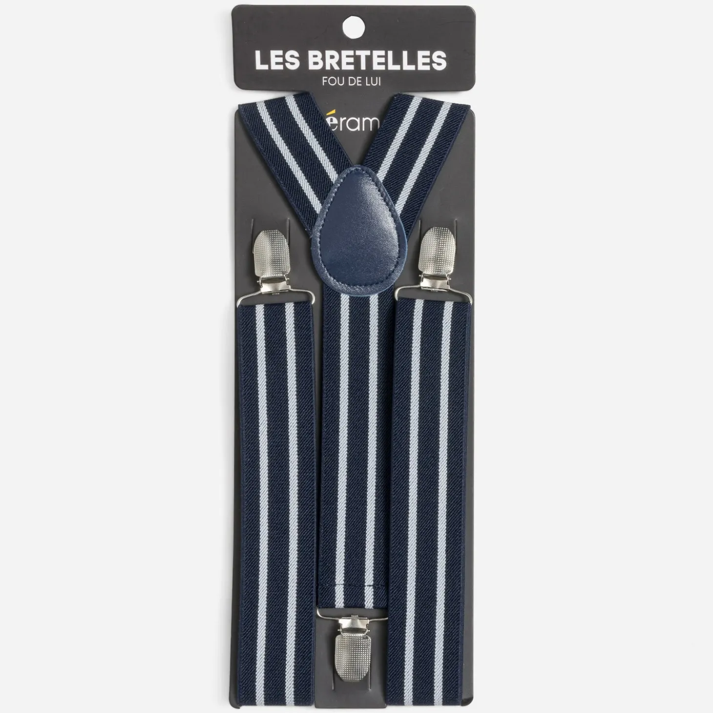 Les bretelles élastiquées pour homme maintiennent bermuda ou pantalon chino, par un système de clips, et s’ajustent selon la hauteur du buste. Elles se déclinent en coloris marine avec rayures blanches, pour accessoiriser une chemise blanche et un bas beige par exemple, avec un canotier en paille, pour un esprit guinguette très estival.