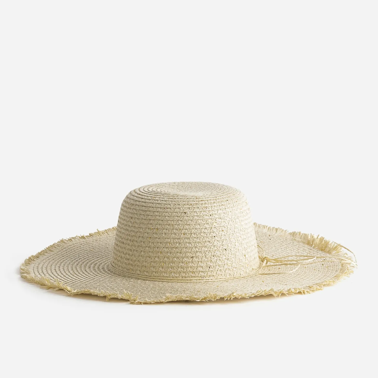 Pour une cérémonie dans un style bohème chic, ou juste pour vous protéger du soleil avec style, choisissez la capeline. Reconnaissable à ses larges bords souples, elle est confectionnée en paille beige, brodée de sequins dorés, qui captent la lumière, offrant alors un jeu de brillance subtil. Elle est soulignée d’une fine cordelette nouée et finalisée par un bord frangé. Sortez vos robes longues et vaporeuses, et votre sac en raphia.