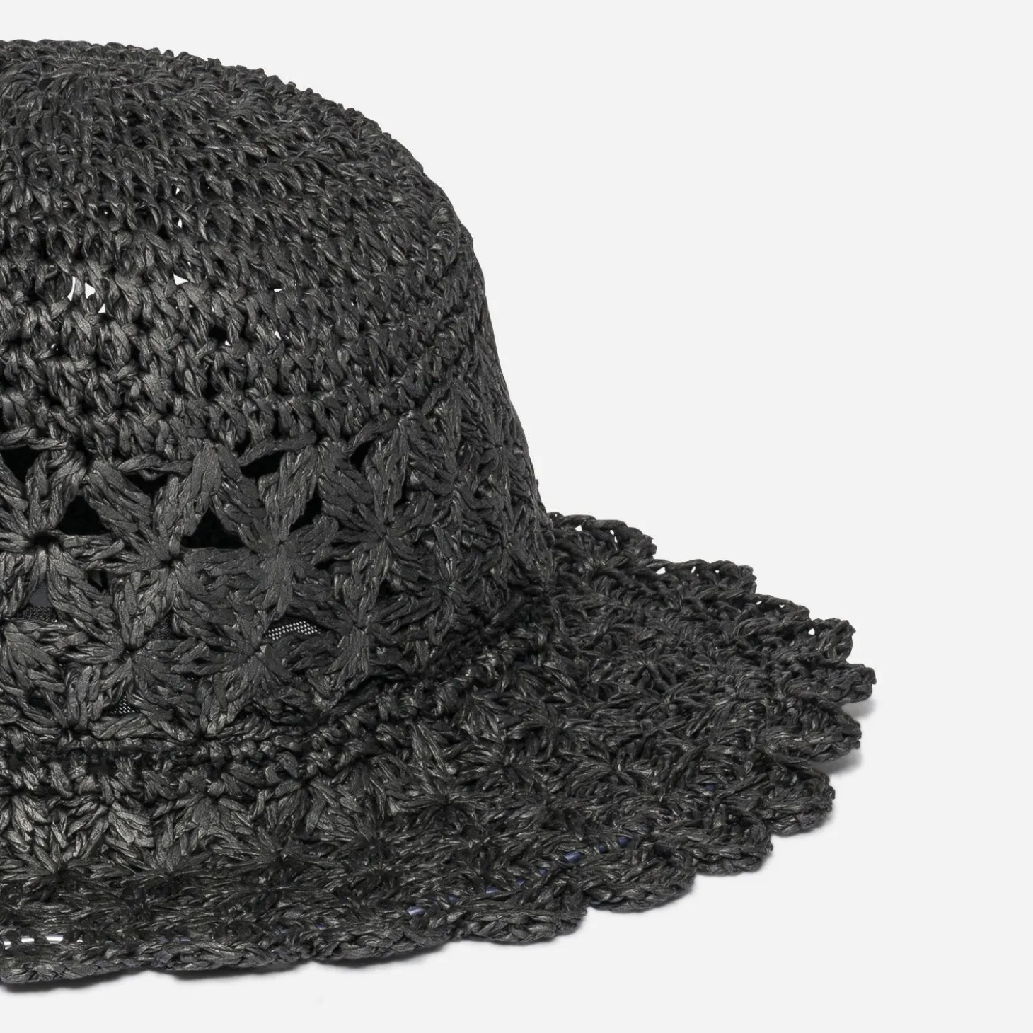 Inspiration forme cloche pour ce joli chapeau d’été. En papier recyclé, il séduit par son tressage ajouré et son coloris noir. Un accessoire qui signe un esprit bohème chic, avec une robe longue noire en broderie anglaise et une paire de sandales compensées en cordes.