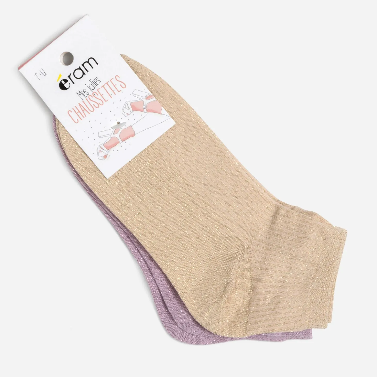 Jeu de côtés délicat, effet pailleté ton sur ton, ces chaussettes sont la touche chic qu’il manquait à vos tenues. L’une beige doré, l’autre rose, elles annoncent, sans aucun doute, l’arrivée imminente du printemps.