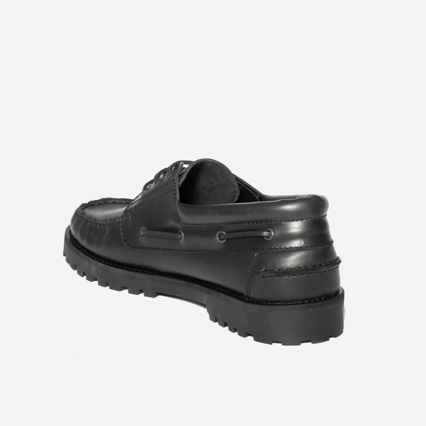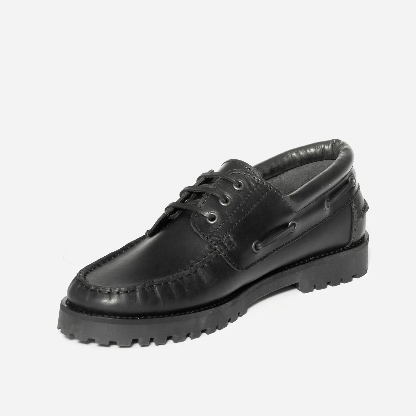 Essentielle, intemporelle, indémodable, la chaussure-bateau revient dans le shoesing masculin. Modernisé par une semelle épaisse et crantée en gomme, elle est confectionnée en cuir lisse noir, assorti au lacet et cordons côtés, tous deux en cuir. Chemise en jean ou à carreaux sur pull à col roulé et jean brut, un uniforme confort et stylé à adopter cette saison.