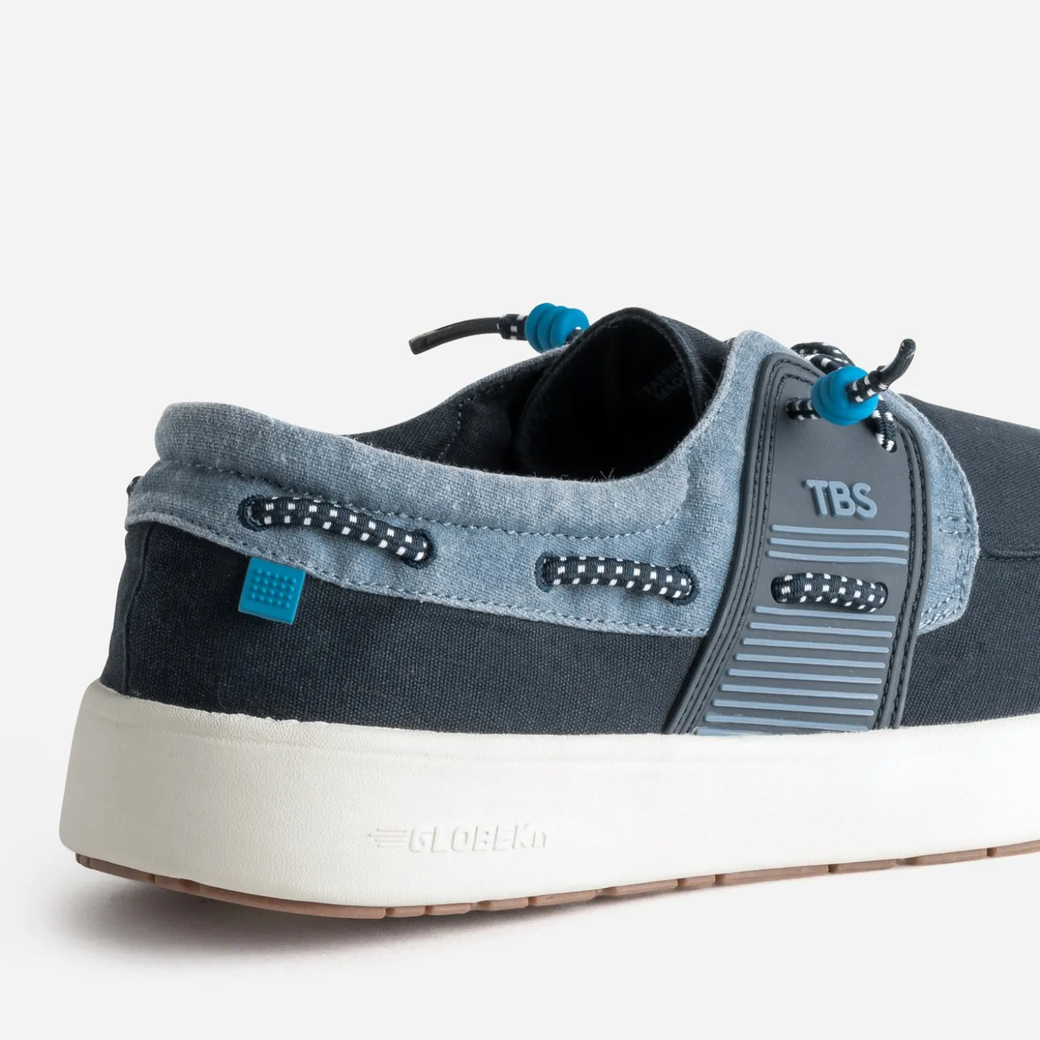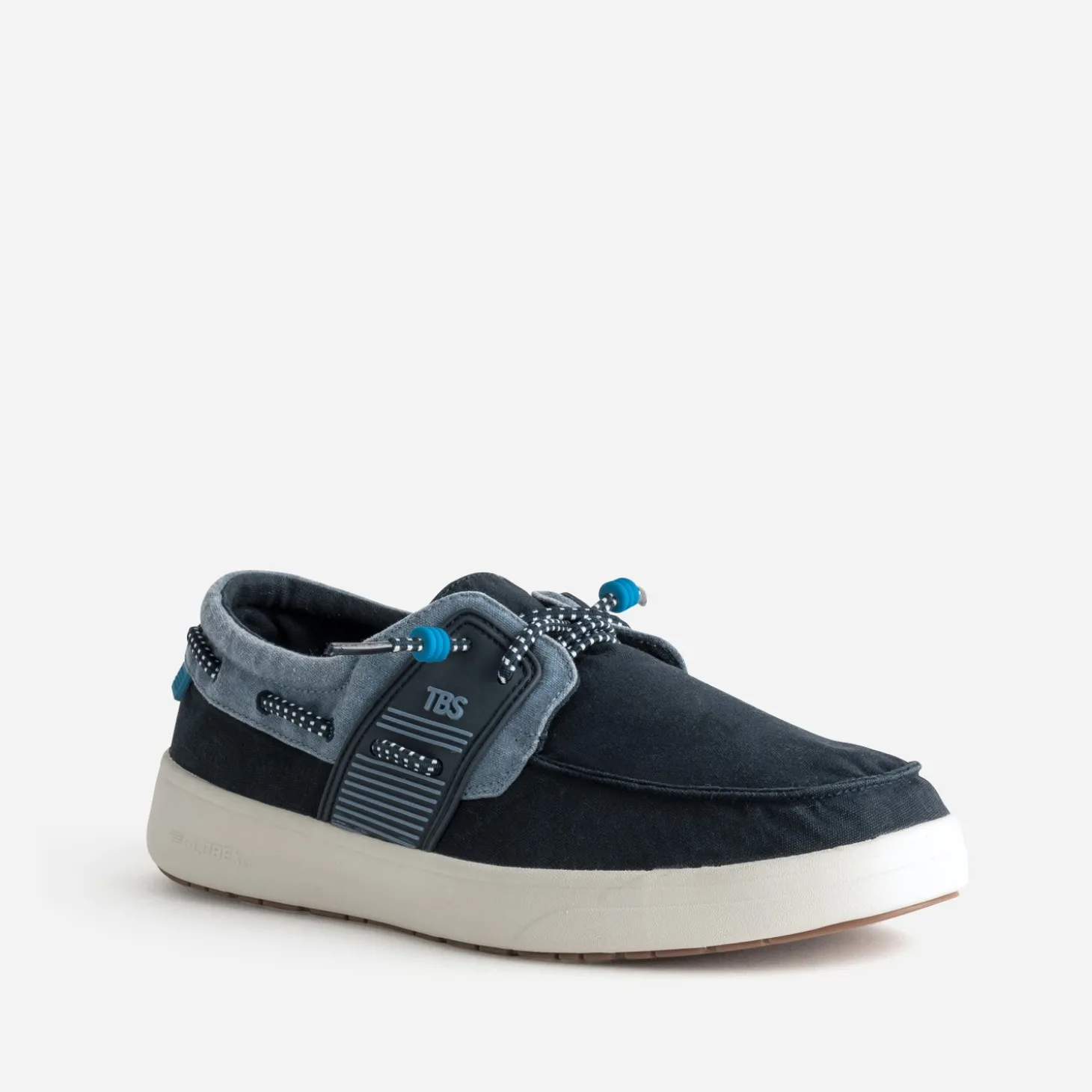 Initialement conçue pour la navigation et la voile, la chaussure-bateau sort de sa zone de confort. Revisitée par une toile marine, elle présente des quartiers bleu ciel, et un lacet façon cordon élastiqué avec stoppeurs. Souple et légère, elle présente une semelle intérieure amovible, pour y glisser une semelle plus adaptée. Un modèle très estival, à réserver aux week-ends et aux vacances, avec un tee-shirt blanc et un bermuda battle bleu.