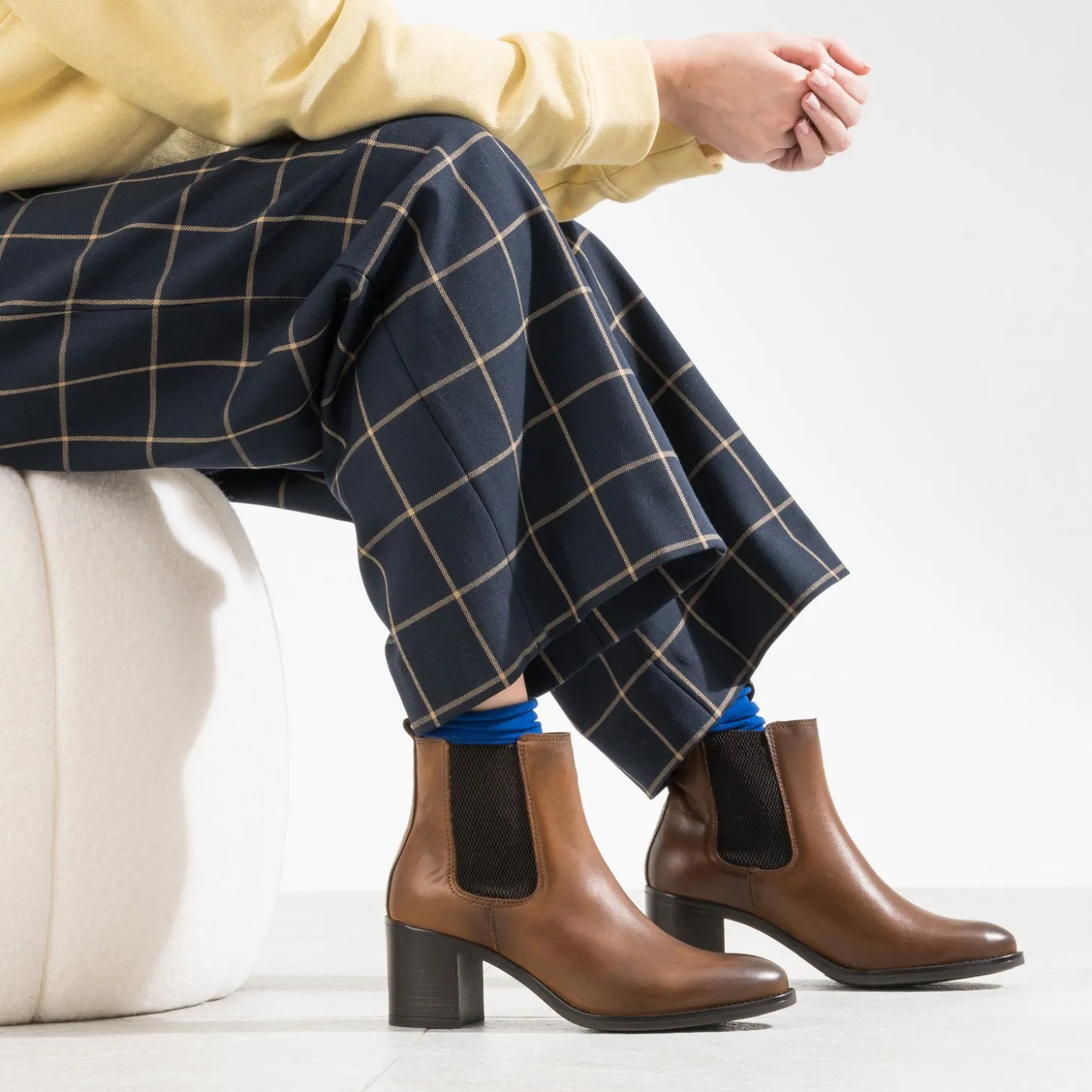 Le Chelsea boots à talon a ce pouvoir de mettre tout le monde (et tous les styles) d’accord. Emprunté au vestiaire masculin, il se féminise par un talon carré de 6,5 cm, d’une parfaite stabilité. En cuir cognac, il s’autorise des élastiquées latéraux fantaisie, avec effet damier. Un modèle dont vous ne pourrez plus vous passer, avec un costume comme avec un jean ou une robe.