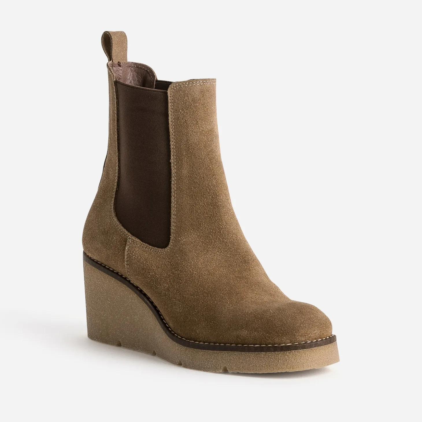 Must-have annoncé pour ce boots femme. Pour son cuir velours, son coloris beige taupé et sa semelle compensée imitation crêpe et crantée. Il surprend par son incroyable confort au porté, grâce à une plateforme d’1,5 cm à l’avant et un talon de 6,5 cm à l’arrière. Un modèle à essayer sans attendre, avec une robe longue beige chiné en tricot à côtes plates ou une cape marron, sur un jean écru.
