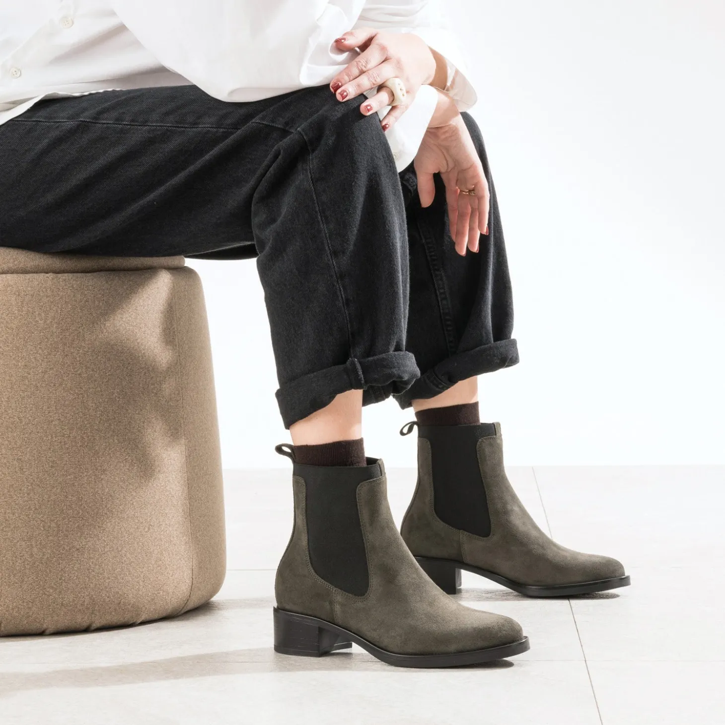 Et si vous passiez à la couleur ? Ce boots pour femme ose un coloris kaki, qui vient sublimer le cuir velours. Il se démarque par des élastiques latéraux, signature du Chelsea boots. Son talon permet un confort optimal au quotidien. Un modèle à accorder, avec un pull et un jean gris.