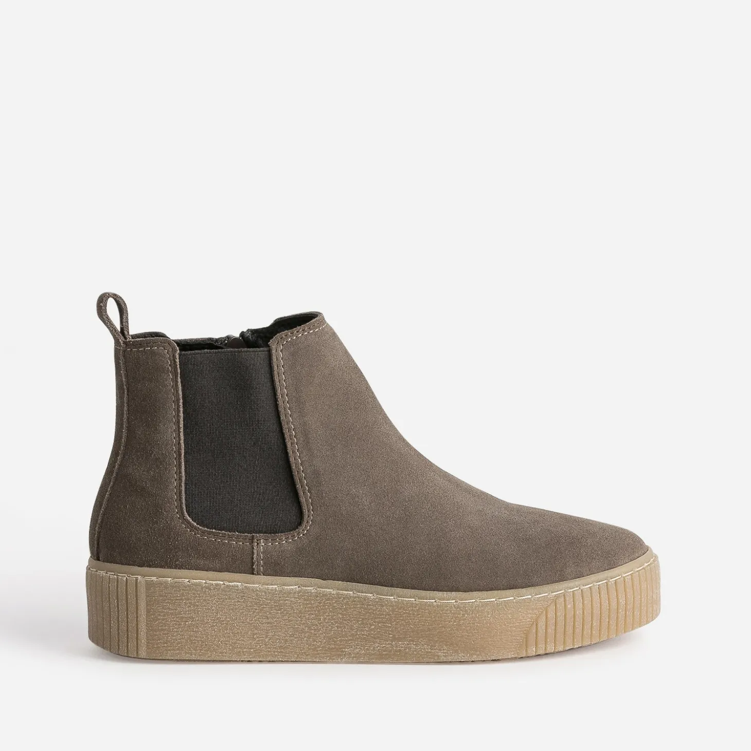 Le Chelsea boots revient en force cette saison. En cuir velours, il se décline en coloris taupe, entre le beige et le gris, et affirme son style par une semelle plateforme effet crêpe. Un modèle casual, à porter avec un pull beige chiné à col roulé, un jean écru et un manteau camel.