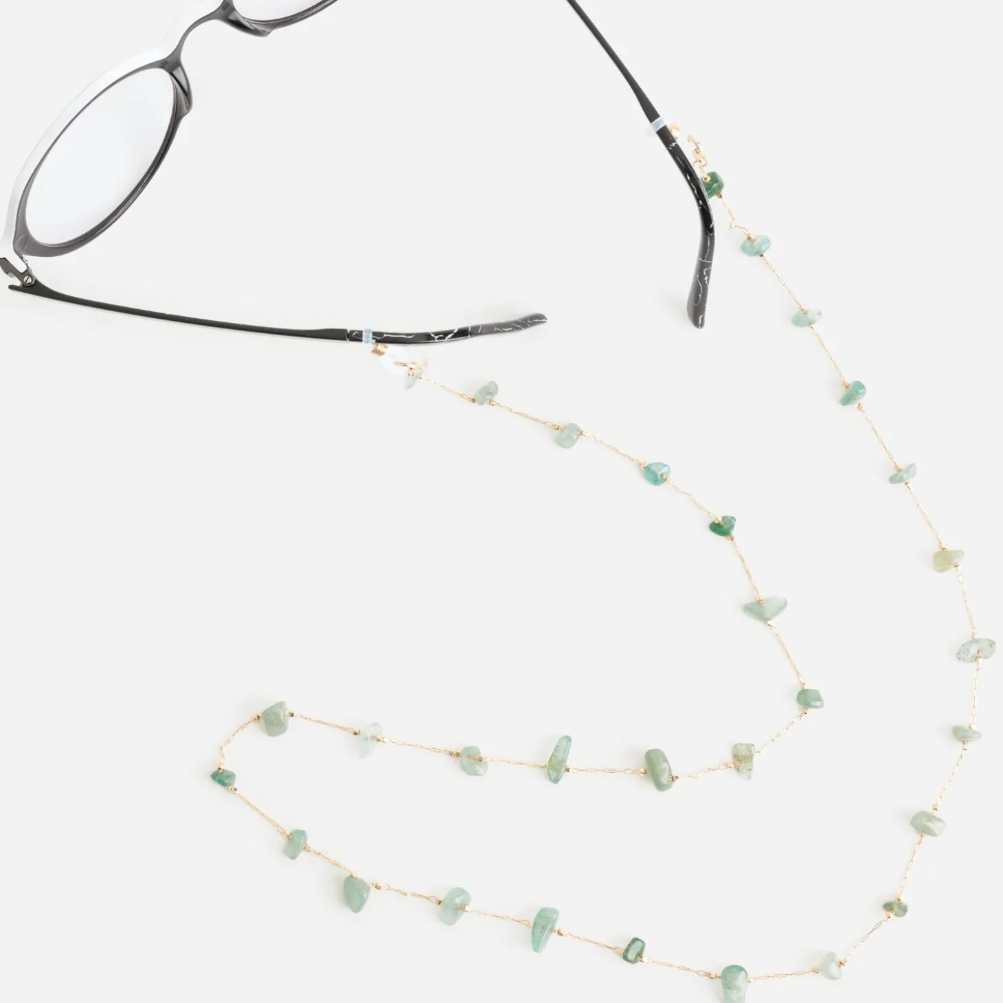 Les lunettes sont plus qu’un simple accessoire de mode. Pour ne plus les perdre, pensez à la chaîne à lunettes comme un bijou chic. Montée sur du métal doré, elle est décorée de petites pierres vertes et finalisée par des boucles antidérapantes en caoutchouc avec butée pour une fixation sûre.