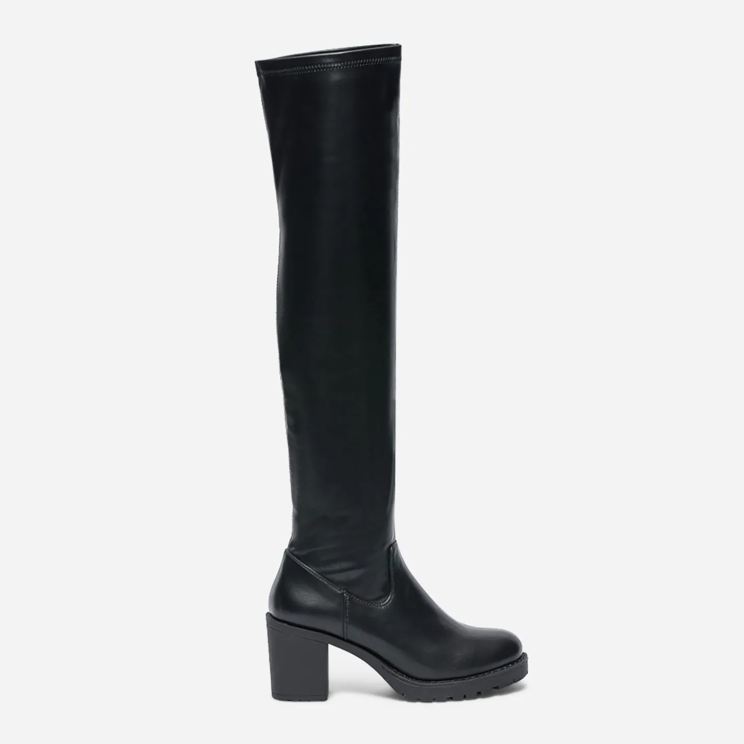 Esprit tout-terrain pour cette cuissarde femme. Montée sur une semelle et un talon large crantés, elle est pensée pour fouler le bitume urbain. Noire, elle est confectionnée en matière synthétique noire, fermée par un zip intérieur qui facilite l’entrée et la sortie du pied et maintient la tige sur le mollet. Un modèle à tester avec un look d’inspiration grunge, sur un leggings en simili et une sur-chemise à carreaux.
