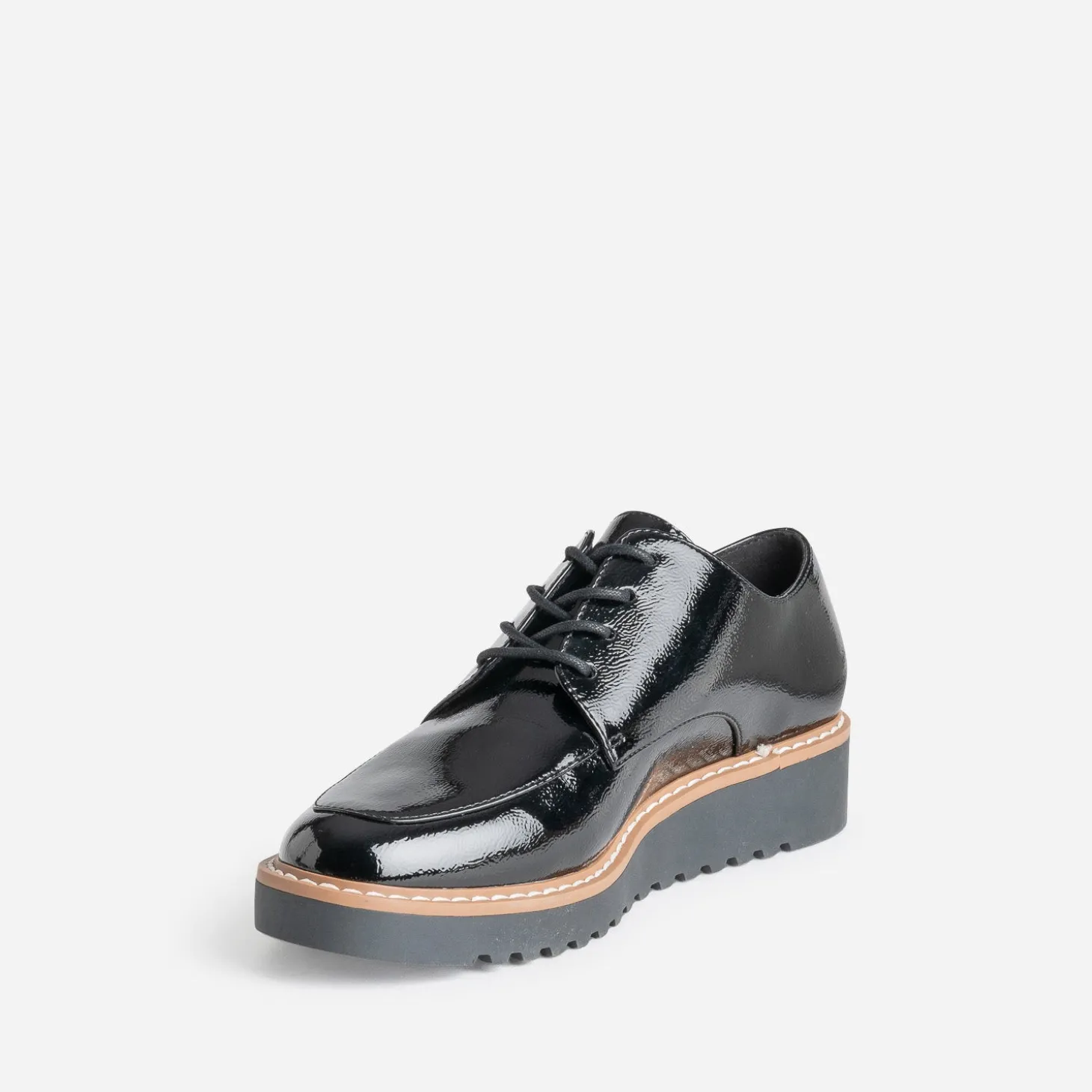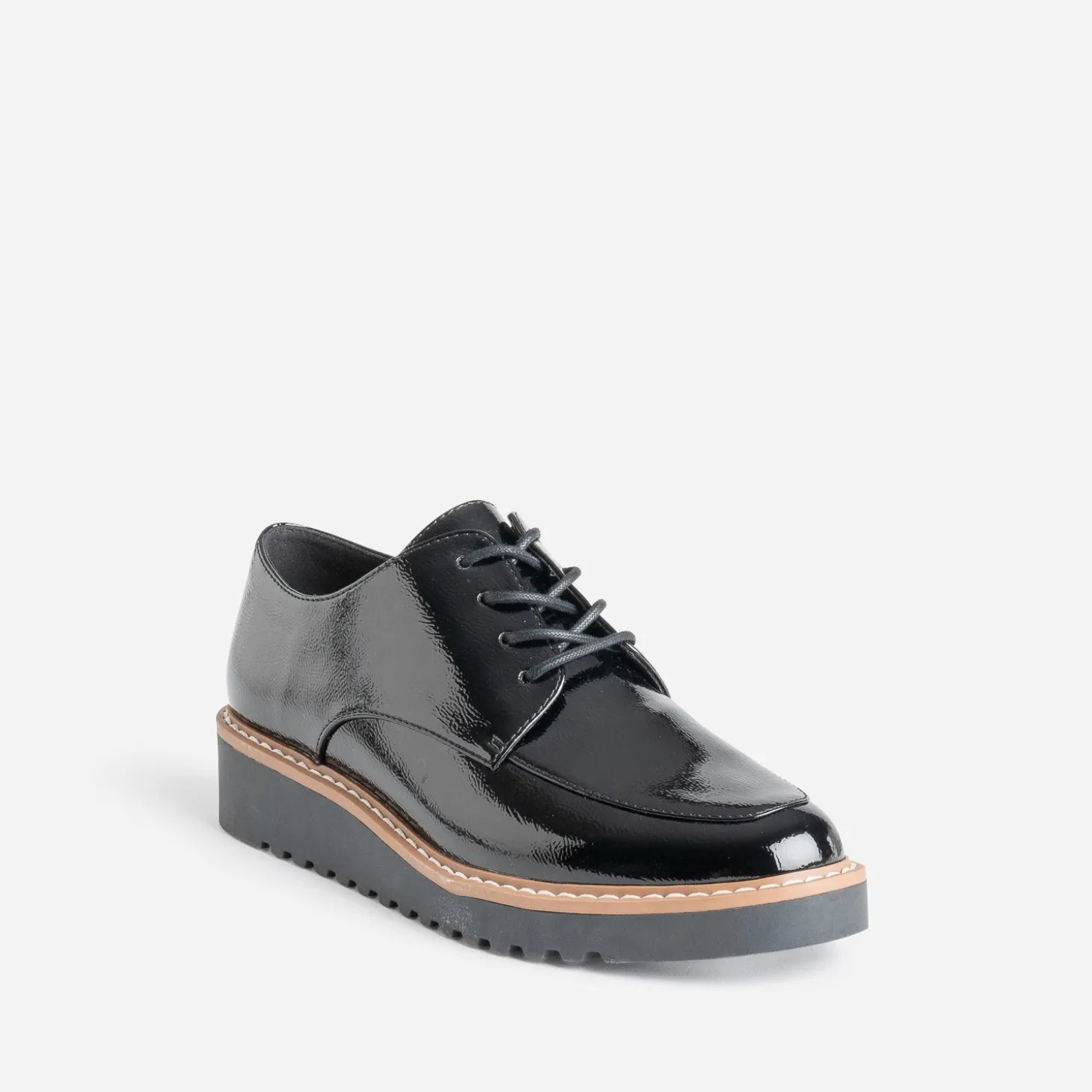 Place au confort, avec ce derby pour femme. Son atout ? Une semelle légèrement compensée. En matière synthétique lisse, il se décline en coloris noir et finition vernie, avec trépointe cousue contrastée. Un modèle à décaler avec un pull à col Claudine et un pantalon à carreaux ou une jupe courte avec des chaussettes hautes.