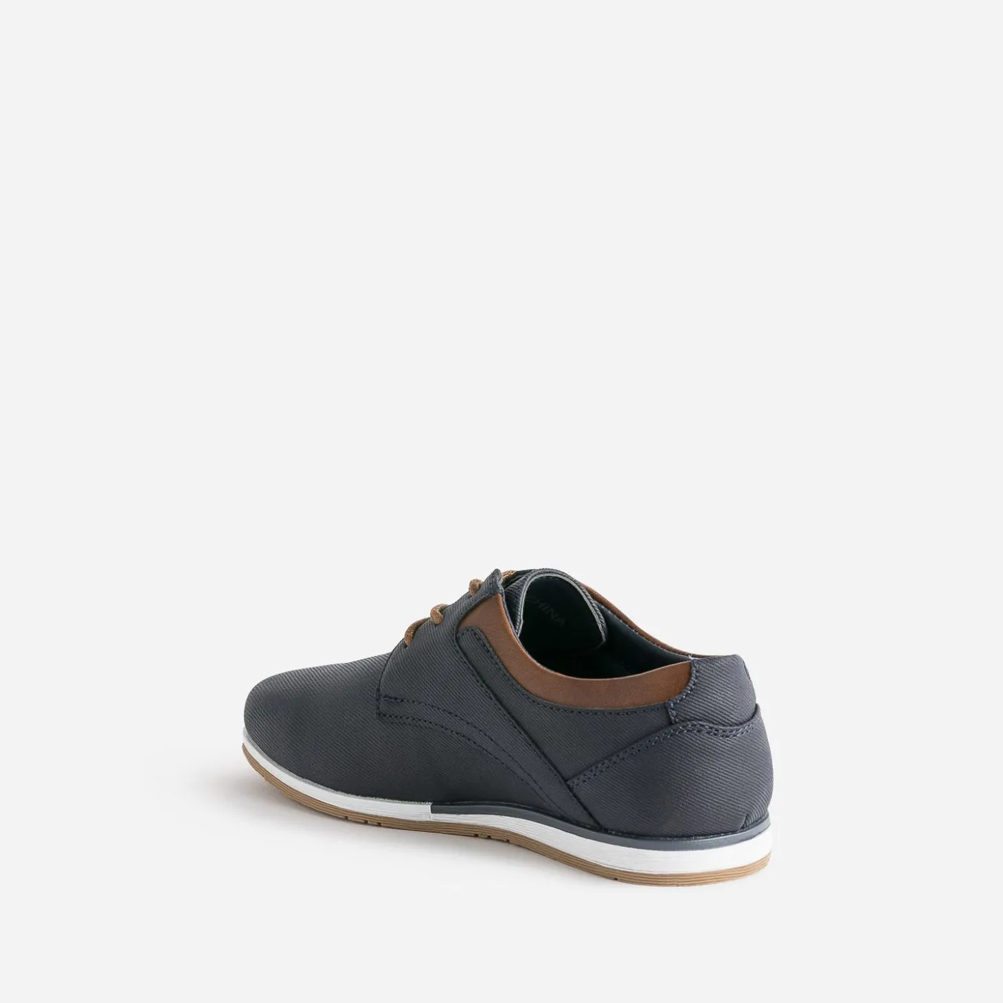 Matière synthétique rainurée, doublure textile chinée, détails marron, ce derby pour garçon s’invite dans le dressing d’été. Il séduit par une semelle tricolore légèrement compensée, pour plus de confort, et un style plus décontracté.