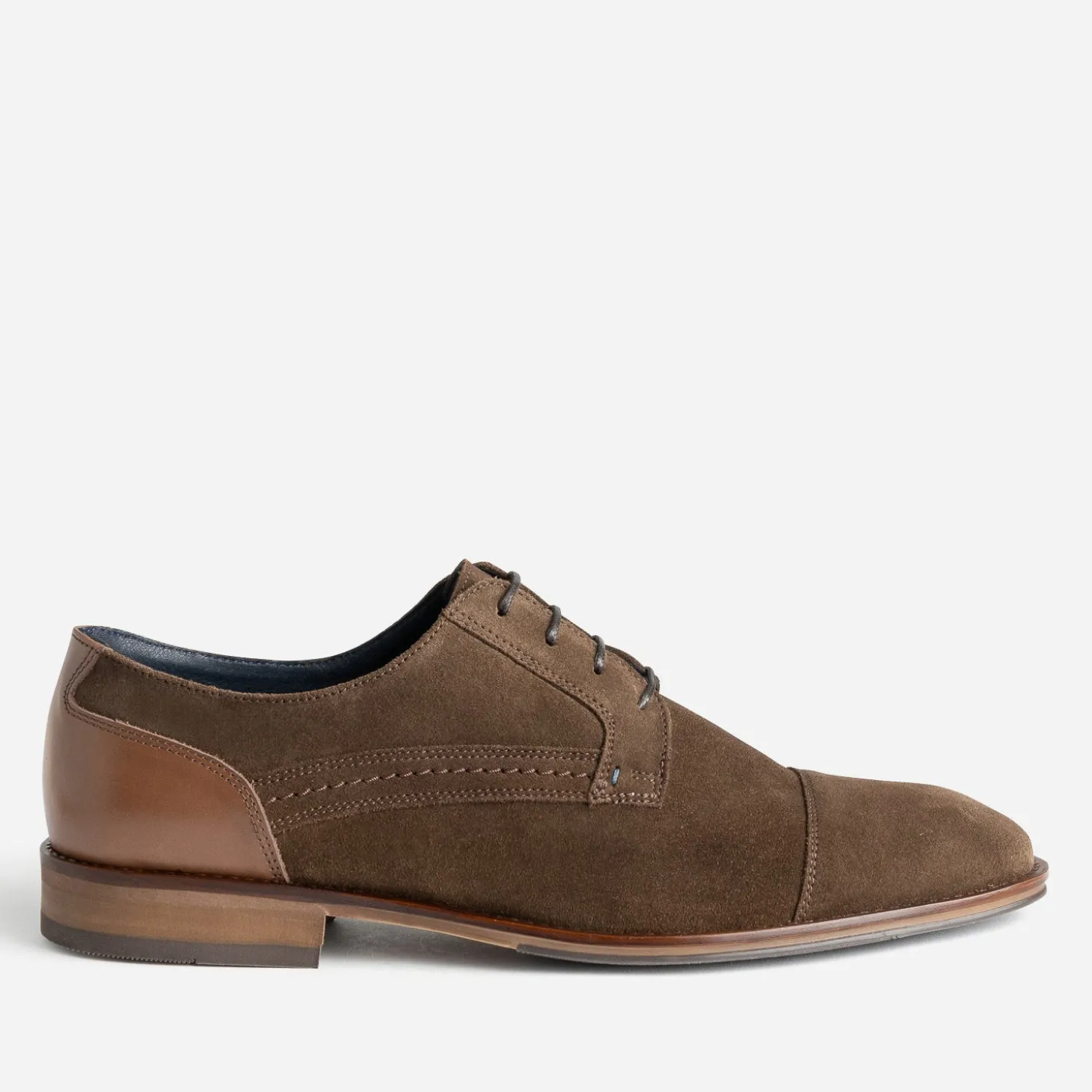 Ce derby pour homme impose son élégance avec évidence. Un cuir velours de belle qualité, un coloris marron foncé, un empiècement en cuir lisse ton sur ton sur le contrefort, un lacet ciré : tout concourt pour défendre un style chic, structuré. Découpes et coutures rythment le modèle jusqu’au bout Molière. Privilégiez-le avec un costume bleu marine ou beige.