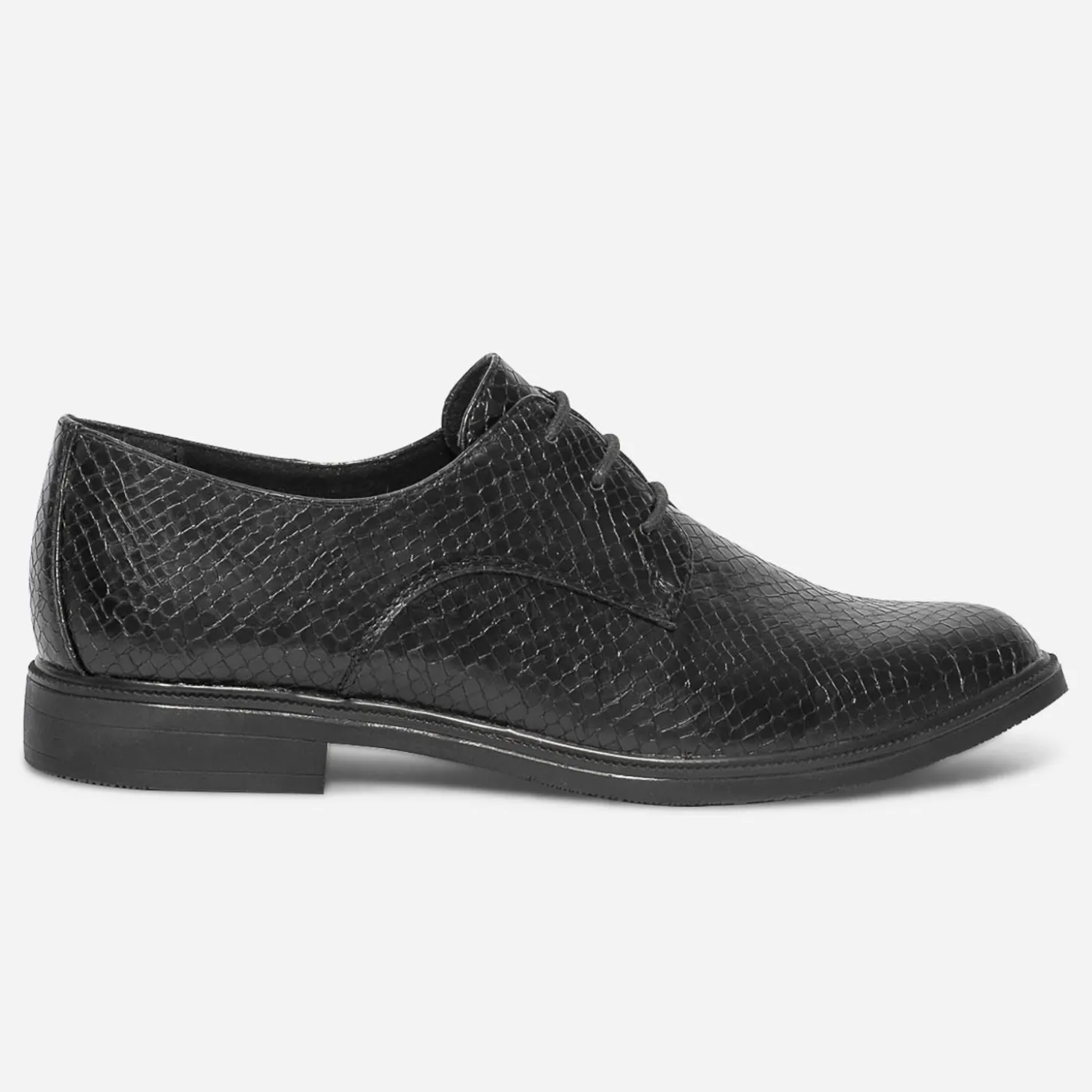 Vous pensez obsession ? On vous répond addiction ! Cet hiver, impossible de passer à côté de la tendance python. L’embossage animalier investit ce derby en cuir synthétique noir. Avec, préférez un look sobre, pour apprivoiser son côté sauvage, comme un pull et un pantalon cigarette.
