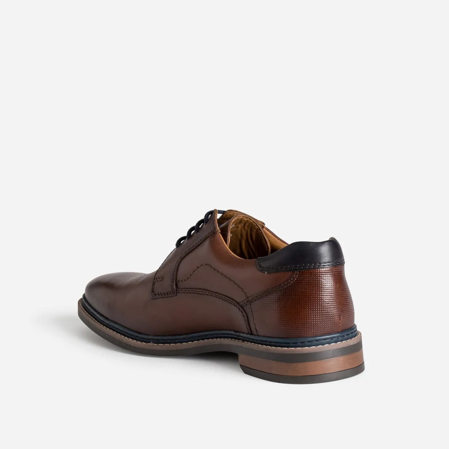 Laissez-vous tenter par le derby en cuir pour homme. Coloris cognac, il se laisse rehausser de touches bleu marine sur la trépointe, le contrefort et le lacet. Un modèle phare en toutes saisons, signature d’un style élégant et intemporel.