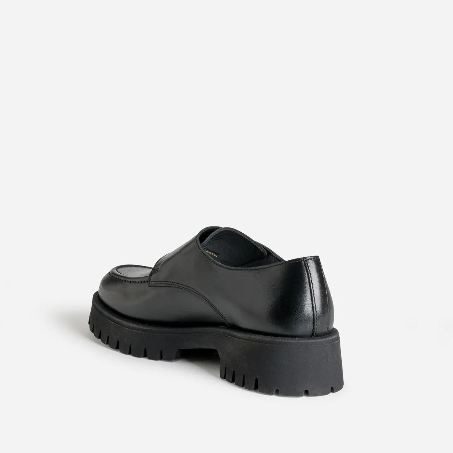 Maxi boucle, maxi semelle crantée, le nouveau derby de la saison voit les choses en grand ! Inspiré par les tendances preppy et rock, il s’impose dans le dressing féminin, en cuir lisse noir et métal gris. Un modèle à oser en blazer et jupe plissée, avec petites chaussettes blanches.