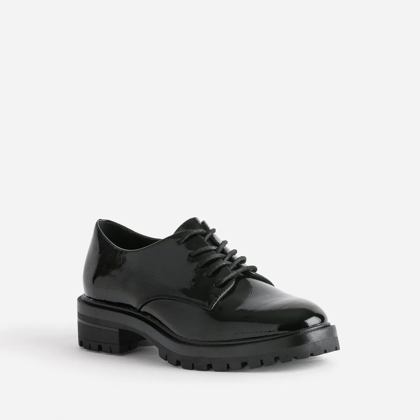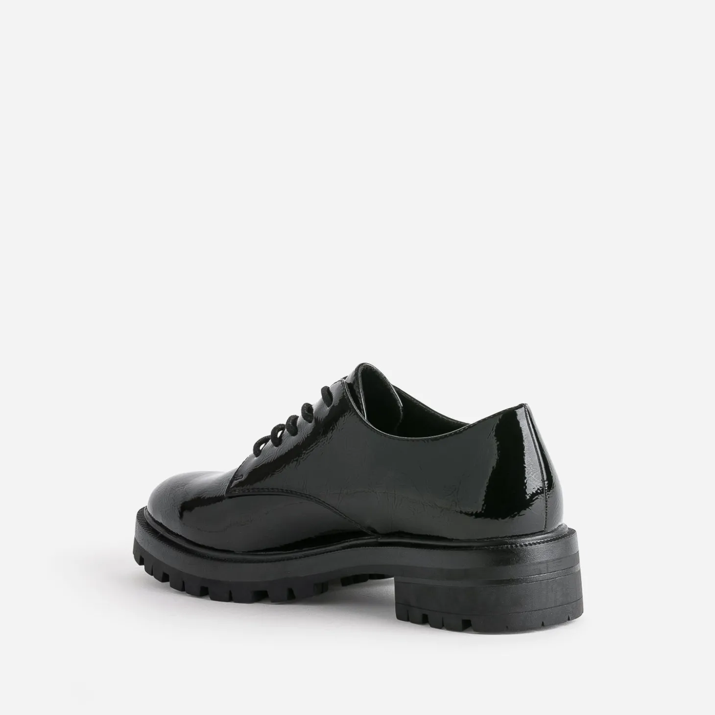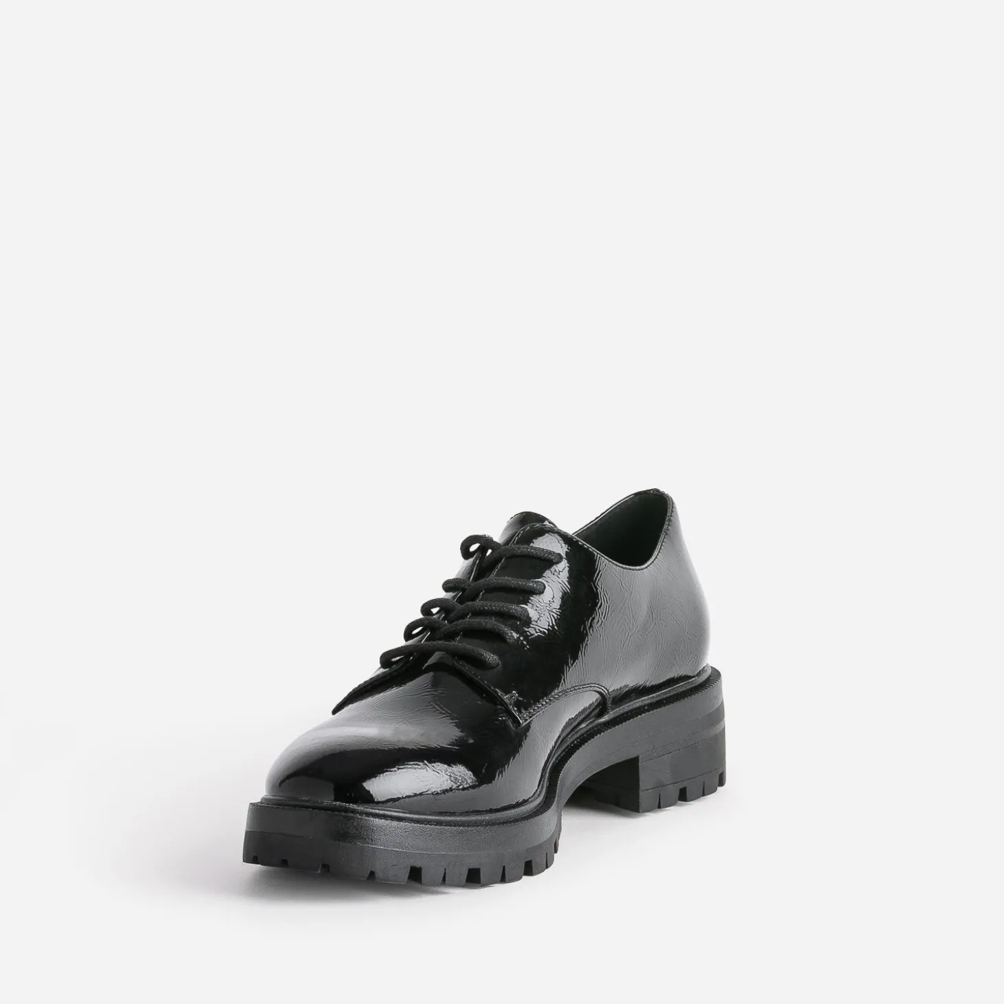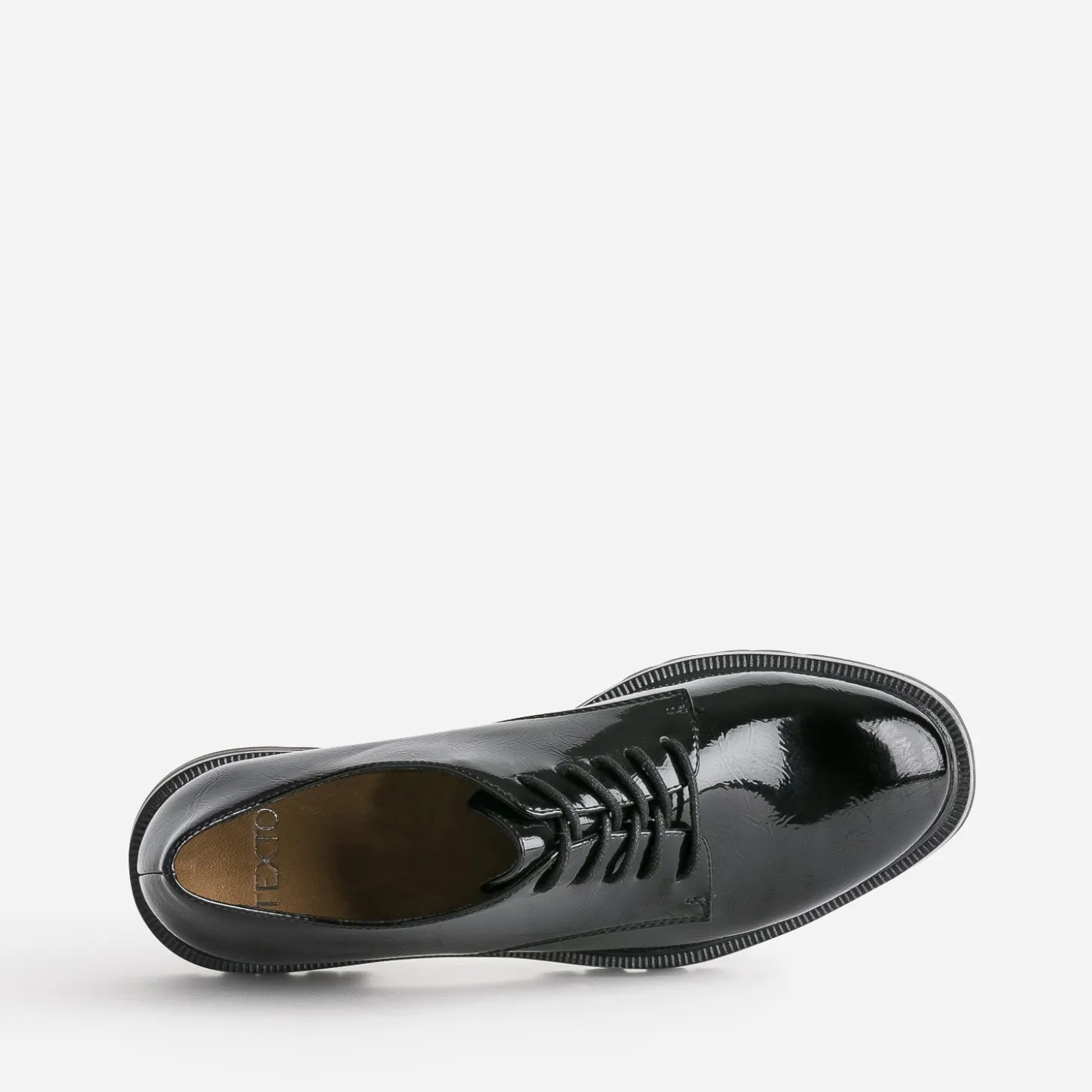 1. Une semelle épaisse et crantée, d’une parfaite stabilité. 2. Un coloris noir et une finition vernie, qui apporte du chic. Voilà 2 bonnes raisons de vous laissez tenter par ce derby pour femme. Synthétique, il présente une doublure textile et une première en cuir. Un modèle monté sur talon de 4 cm, pour vous accompagner, au quotidien et sans contraintes, dans tous vos déplacements.