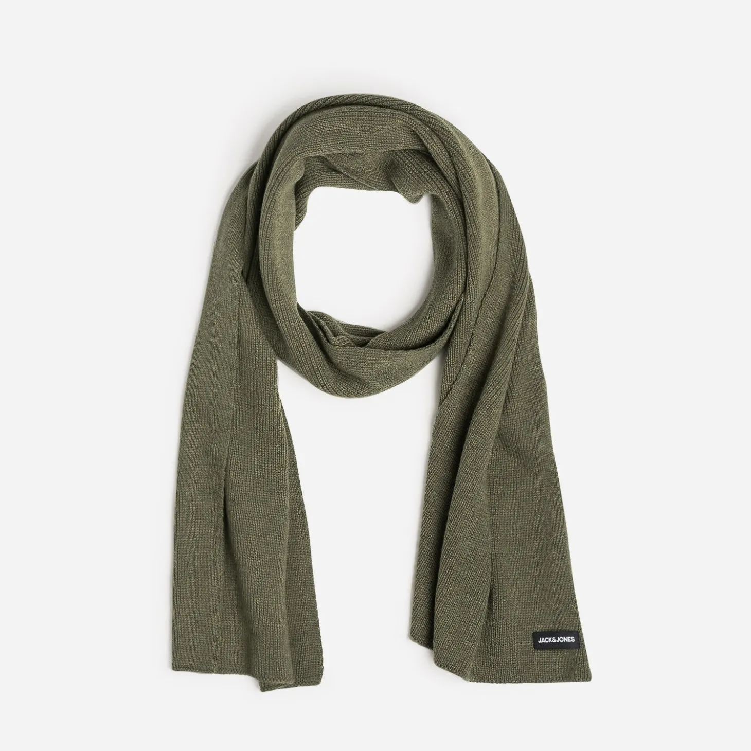 Réchauffez vos looks d’hiver avec sobriété. Posez l’écharpe kaki chiné en tricot sur un pull col roulé beige, un jean gris et une parka kaki.