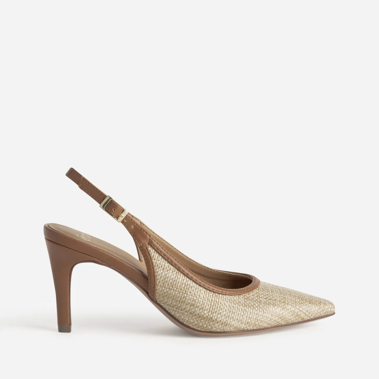 Avis aux fans des escarpins et des talons fins. Jetez votre dévolu sur la slingback, qui dévoile le talon avec élégance. Bout pointu et talon fin de 8 cm, elle est confectionnée en raphia tressé beige, souligné d’une bordure camel, prolongée par une bride. Un modèle idéal pour l’entre-saison, à tester avec un pull à manches courtes et un pantalon large cropped, dans un monochrome beige.