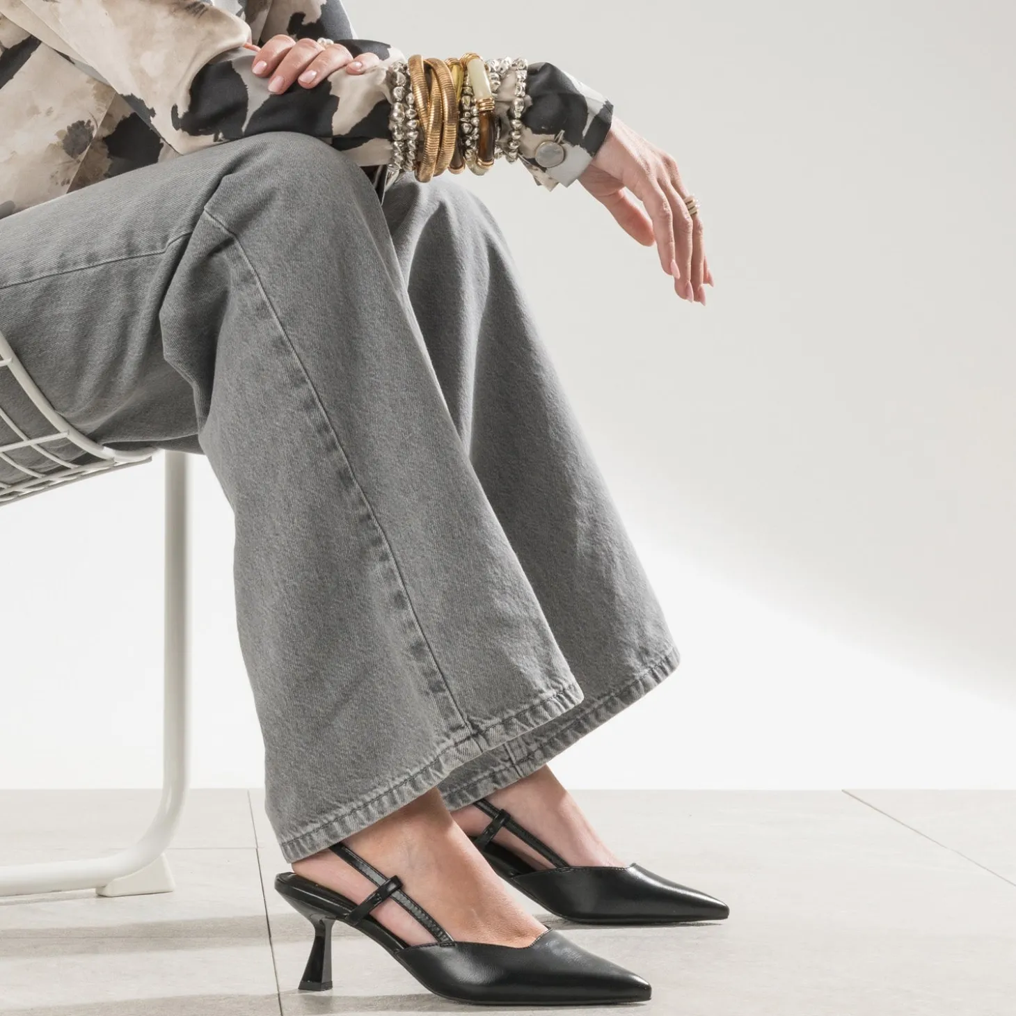 Mis en lumière sur les podiums et plébiscité par les femmes les plus stylées, l’escarpin slingback confirme son statut de it-shoes de la saison. Féminine, elle est reconnaissable à son jeu de brides qui dévoilent le talon. En matière synthétique lisse, elle préfère le noir, sobre et intemporel, et s’affirme par un bout pointu qui affine le pied. Un modèle résolument mode, à entretenir avec un costume 3-pièces à motif pied-de-poule sur gilet noir.