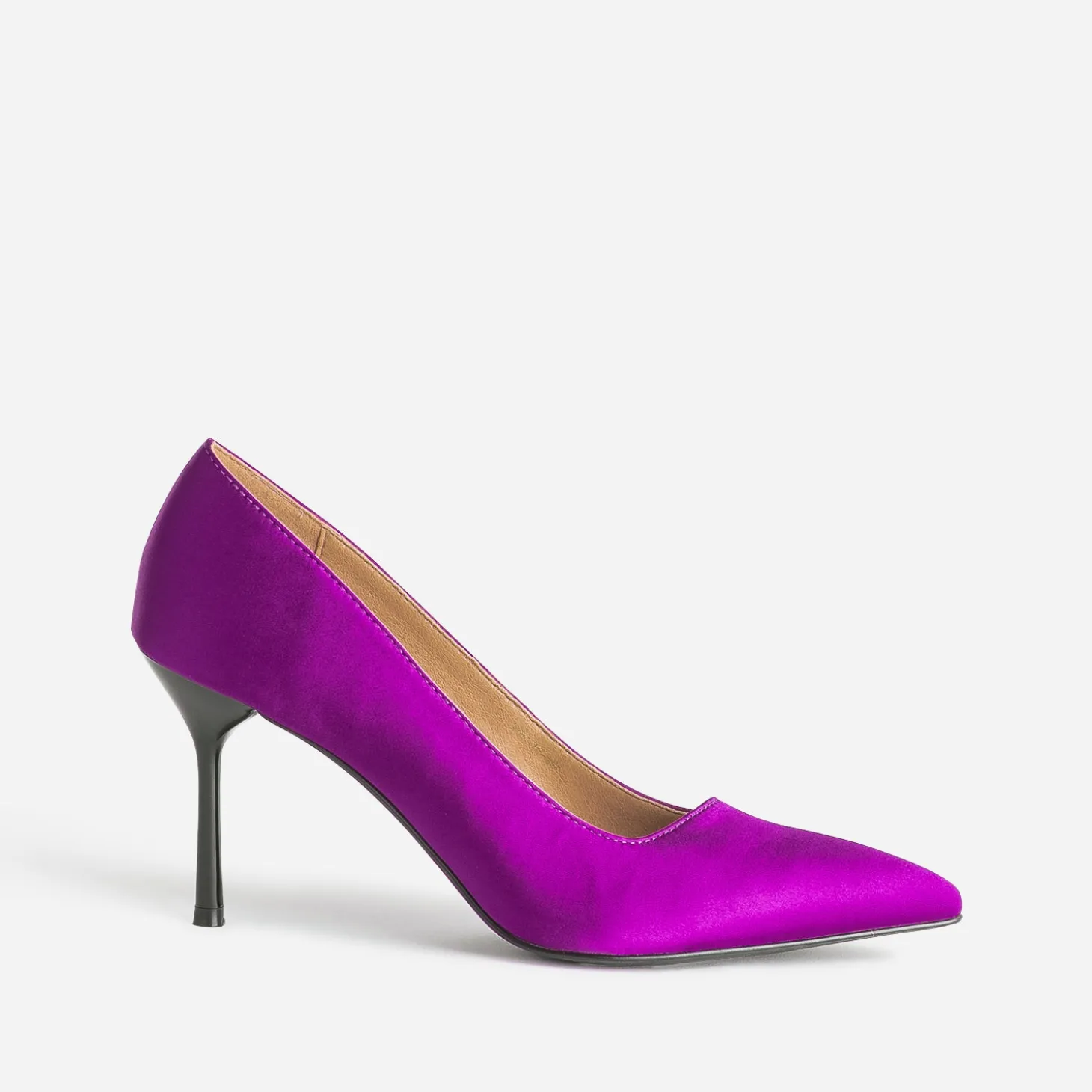 It’s party time ! L’escarpin femme est la signature des working girls et des soirées d’exception. Violet, avec finition satiné et bout pointu, il se démarque par un talon fin de 8 cm et une découpe en biais sur le dessus du pied. Jupe-crayon ou tailleur-pantalon, il se collectionne et se porte sans modération.