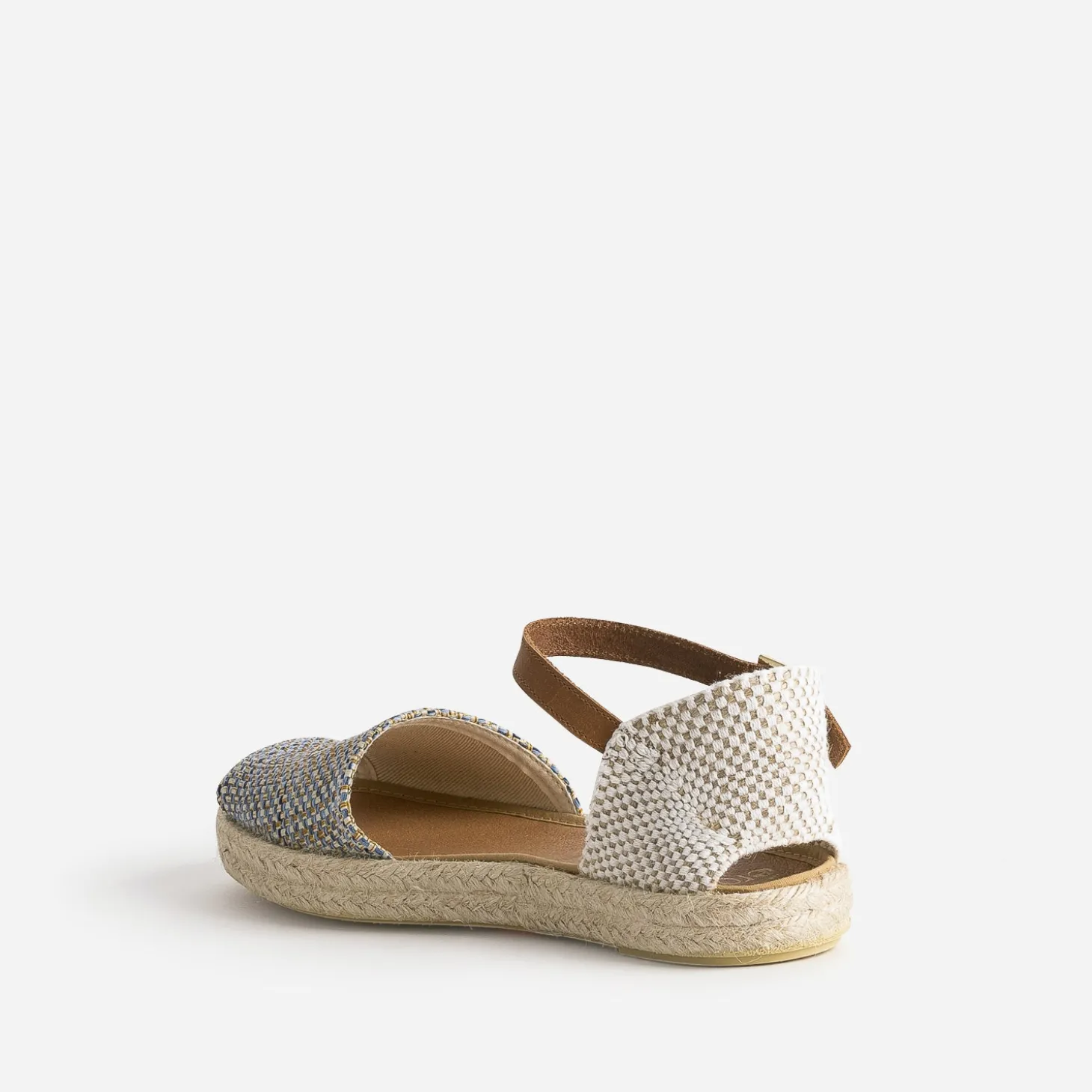Joli jeu de tressage étudié pour cette espadrille femme revisitée. Version sandale, elle laisse apparaître le bout des orteils par une découpe, sous large bride fantaisie dans les tons de bleu et de beige et est maintenue par une fine bride à la cheville. Privilégiez-la avec une tenue décontractée, autour du denim ou du lin, dans les mêmes teintes.