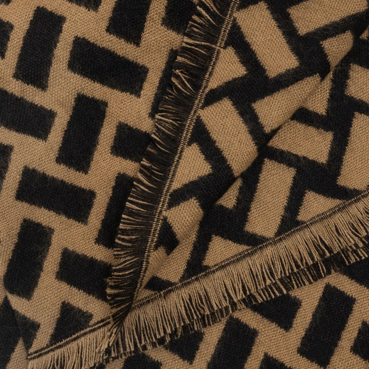 Lignes graphiques noires sur fond camel ou motifs géométriques camel sur fond noir. Cette grande étole est un accessoire incontournable des looks d’automne et d’hiver. Ses grandes dimensions permettent de s’y enrouler, sur un manteau dans les mêmes tons.