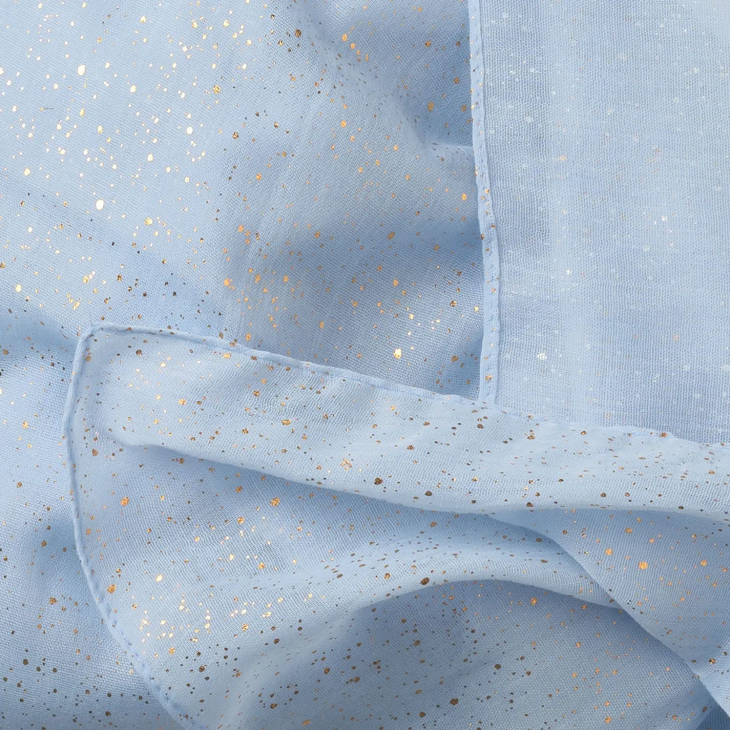 Le bleu ciel est un coloris pastel, qui matche avec la plupart des couleurs. C’est l’idéal pour un accessoire. Comme ce foulard femme, de belles dimensions, rehaussé d’un effet tachiste pailleté doré.