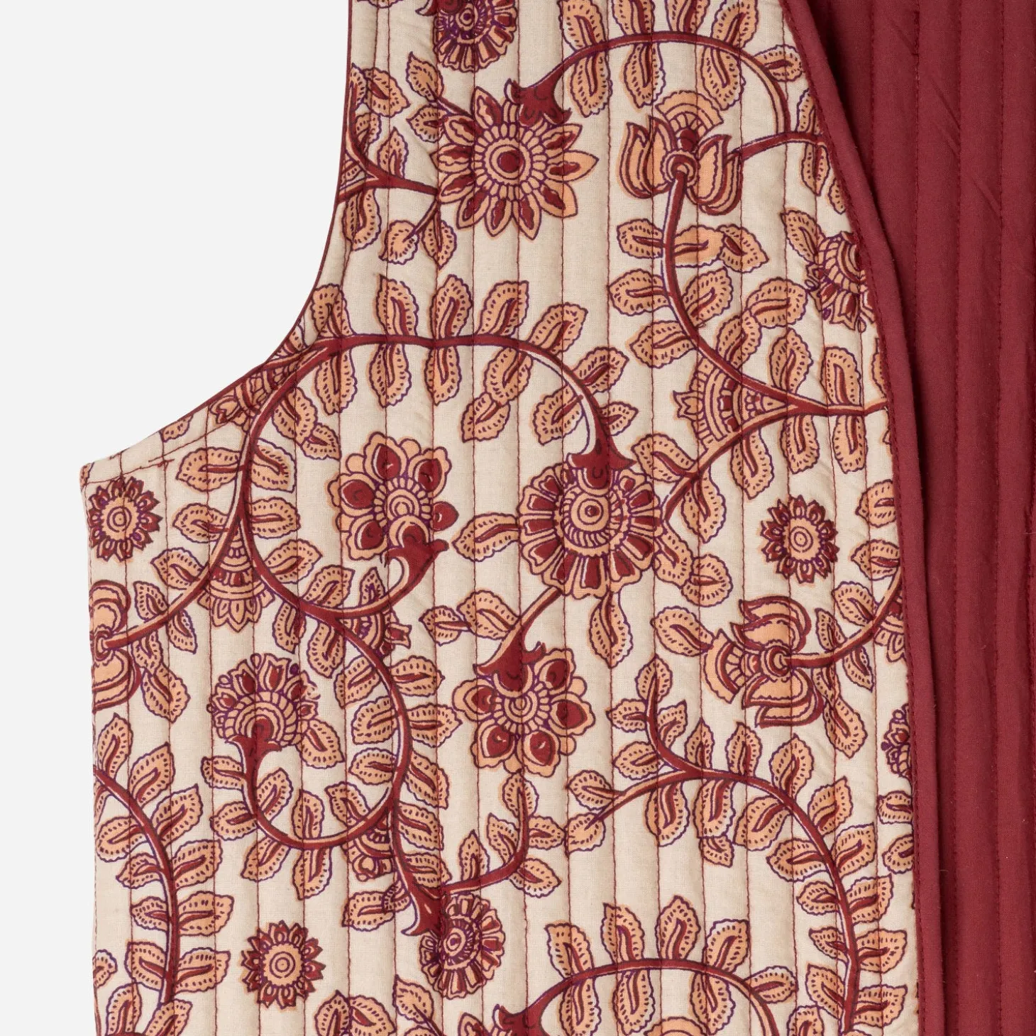 Forme droite, encolure V, sans manches, imprimé fleurs indiennes, surpiqûres pour effet matelassé, sans fermeture, réversible.