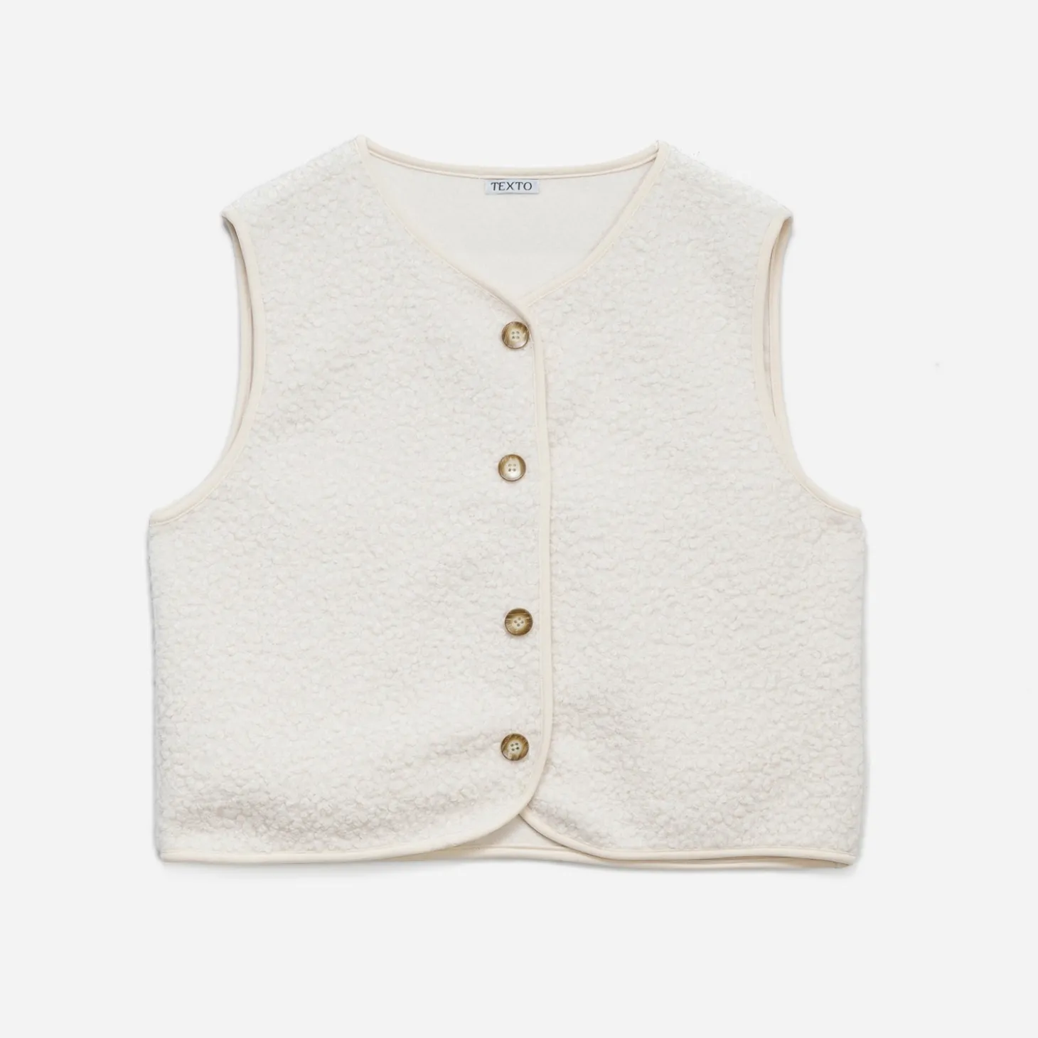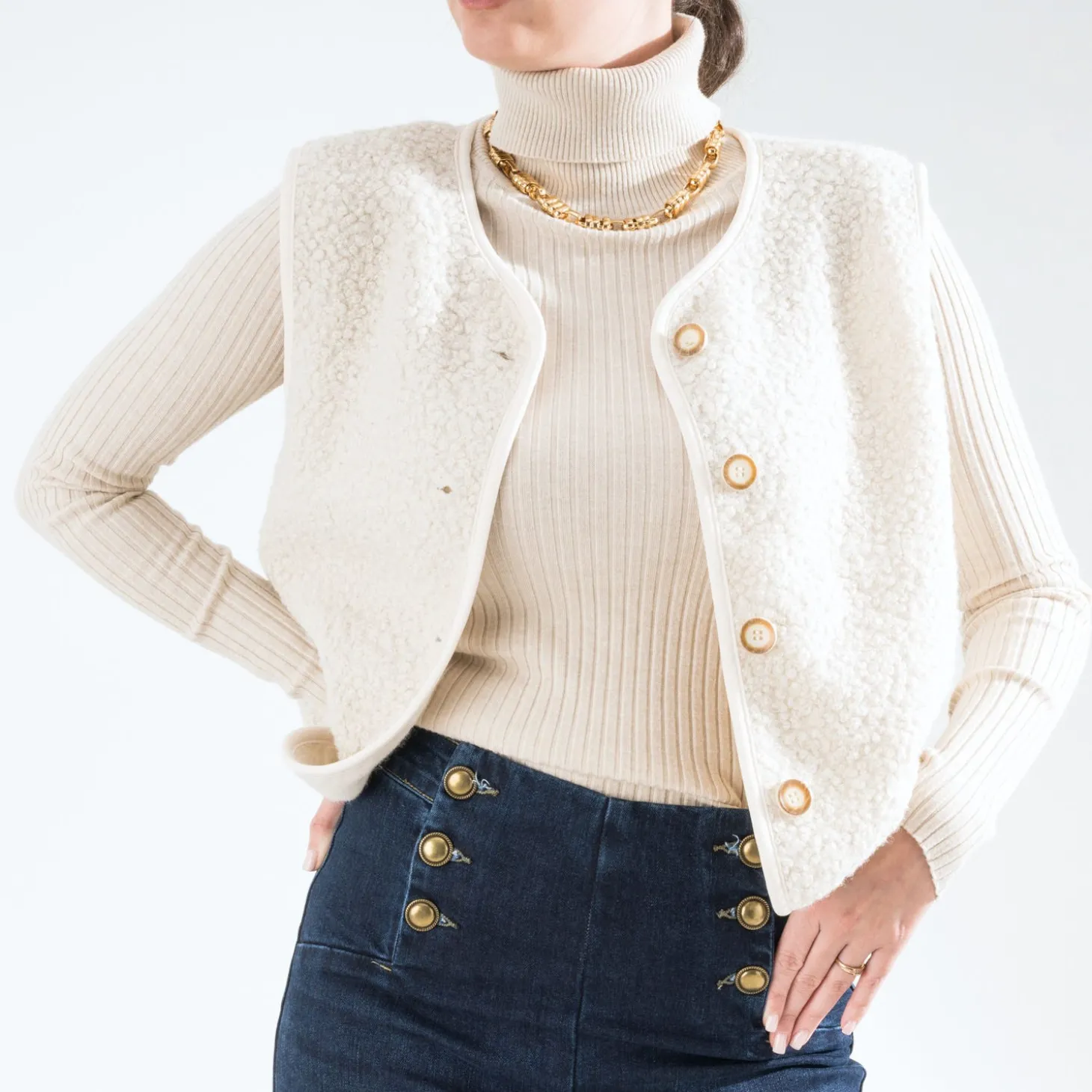 Vous connaissez le layering ? C’est une tendance qui consiste à superposer les vêtements, avec un style étudié. Le gilet sans manches n’y fait pas exception : en textile sherpa écru façon bouclette, il vient réchauffer les looks de la saison. Un modèle à associer avec des teintes naturelles et des matières cosy.