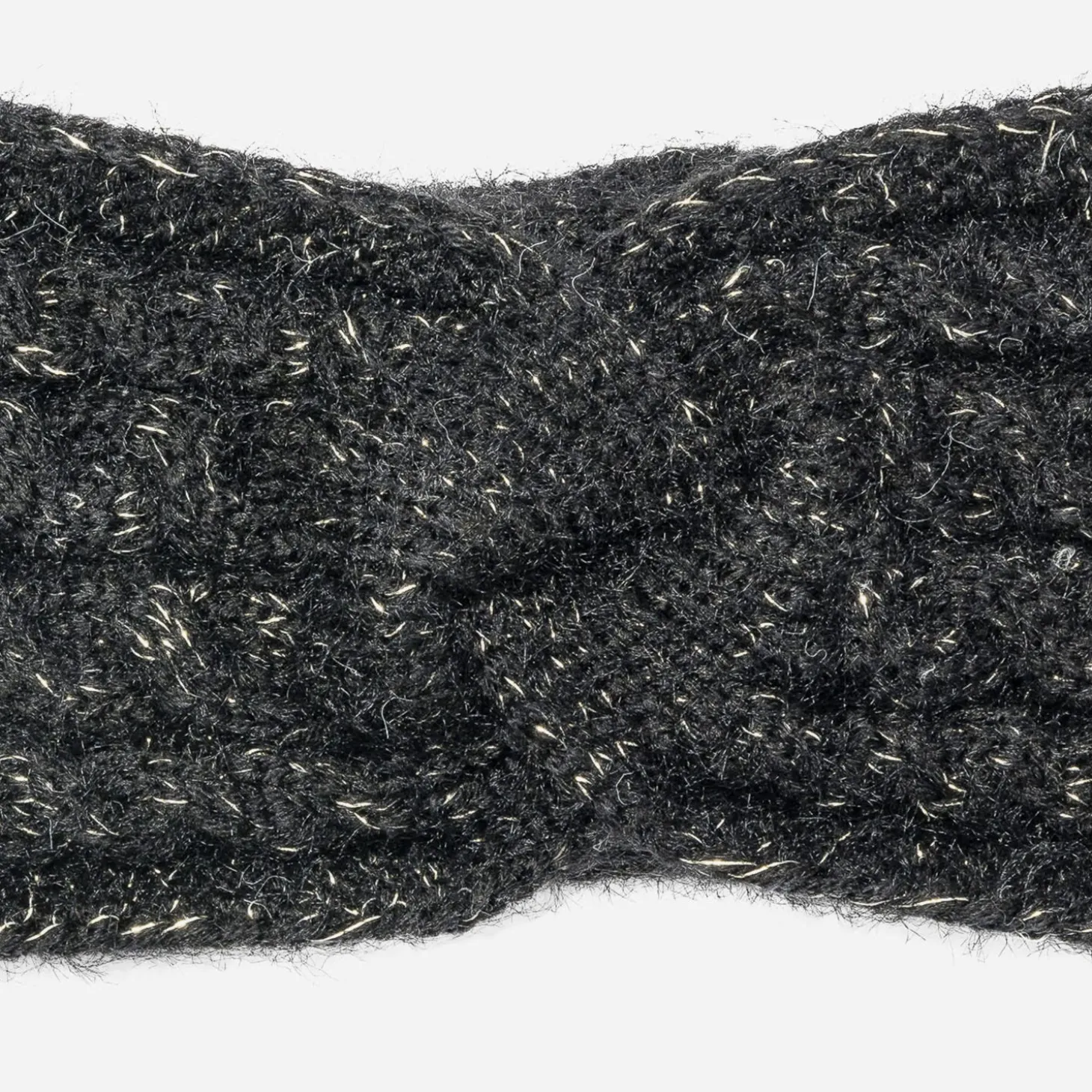 Tricot rythmé de torsades, coloris noir twisté de fils dorés, le headband est assurément raffiné. Taille unique, il convient à toutes les têtes, pour éviter… les prises de tête !