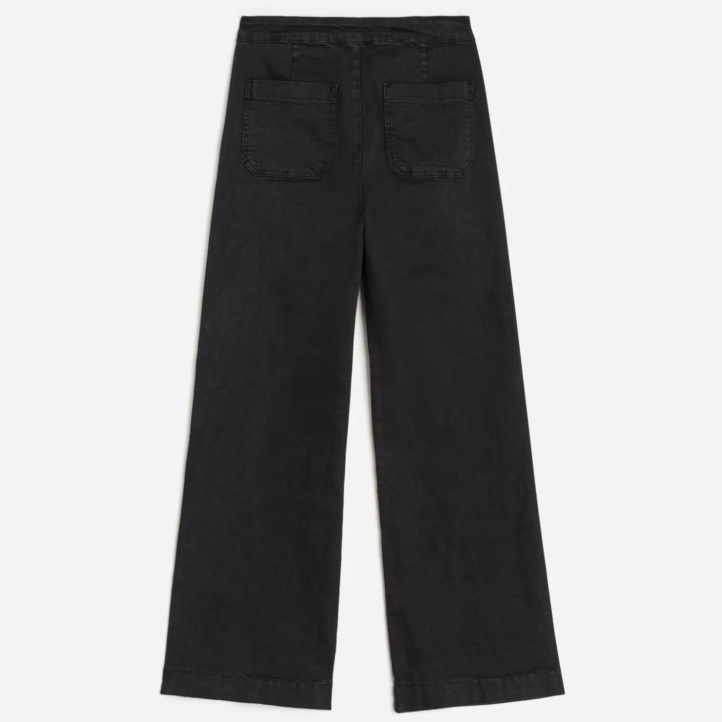 Le pantalon à pont n’a pas fini de faire parler de lui ! Imaginé en toile denim noire, il opte pour une taille haute, mise en valeur par une fermeture par double boutonnage et boutons en métal doré. Un must-have à assumer avec une marinière et une paire de boots à talon.