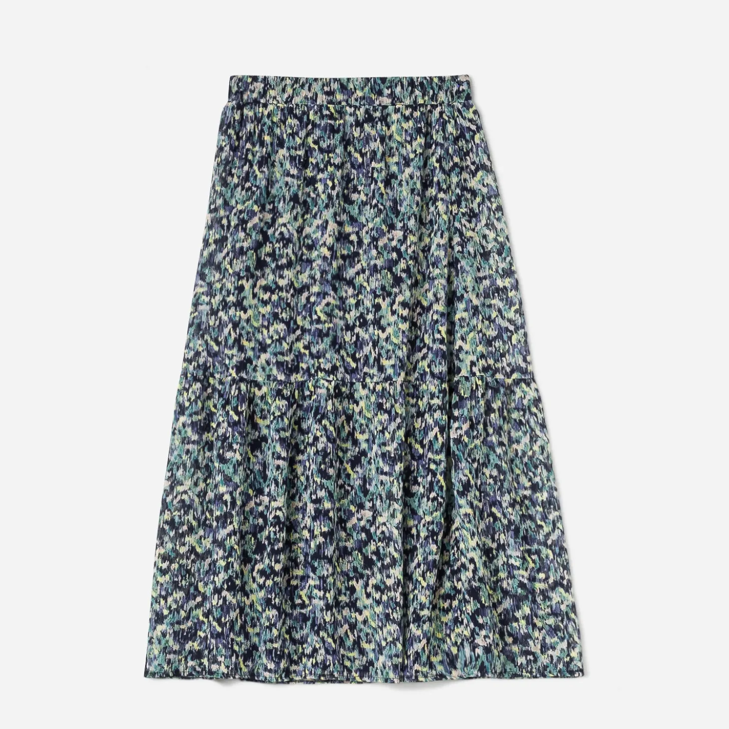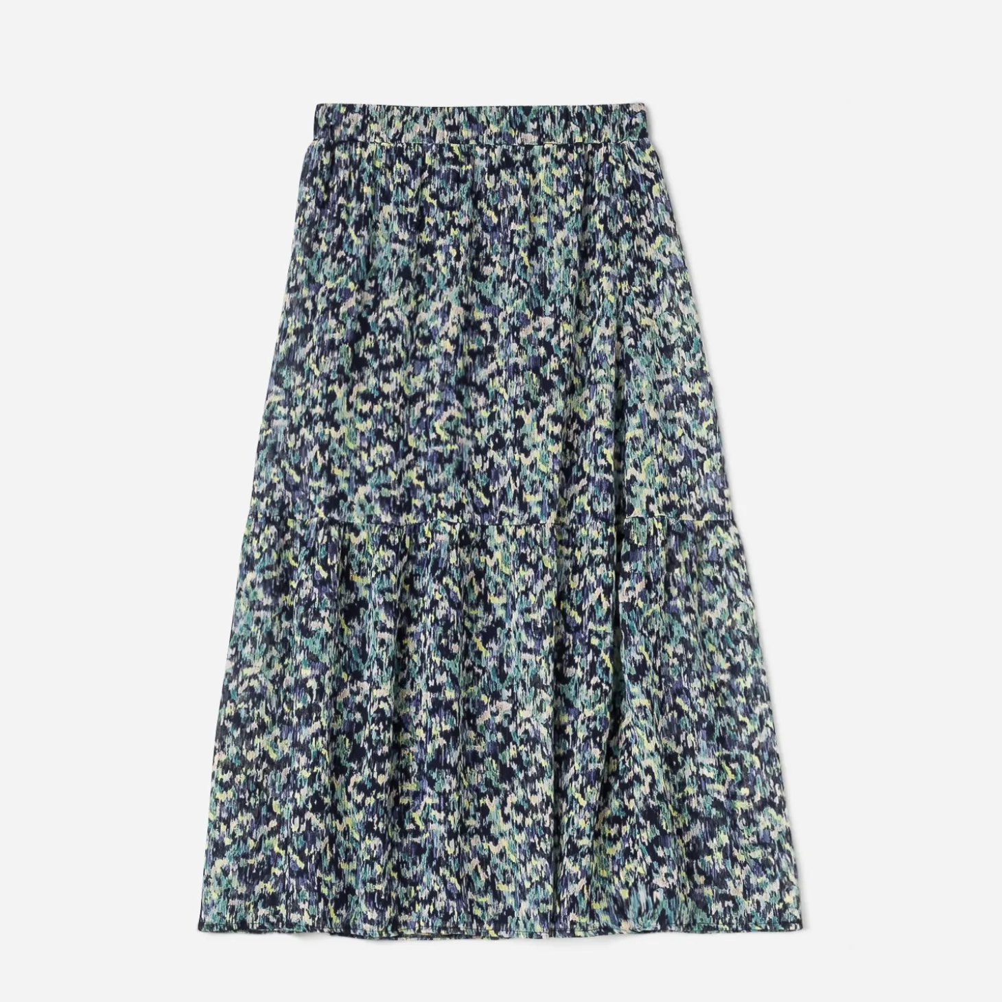 La jupe longue est une grande tendance de la saison. Evasée et fluide, elle se décline en coloris bleu marine, sublimé par un motif tachiste ciel, vert, jaune pastel. Idéale pour les journées chaudes d’été, avec un tee-shirt blanc.