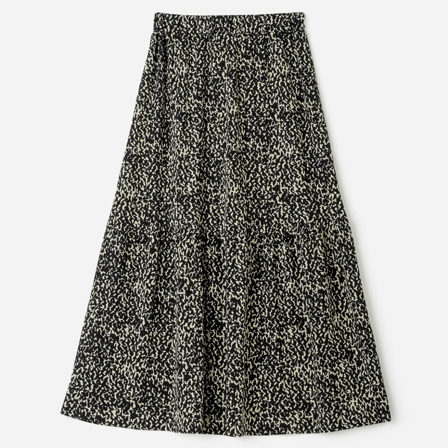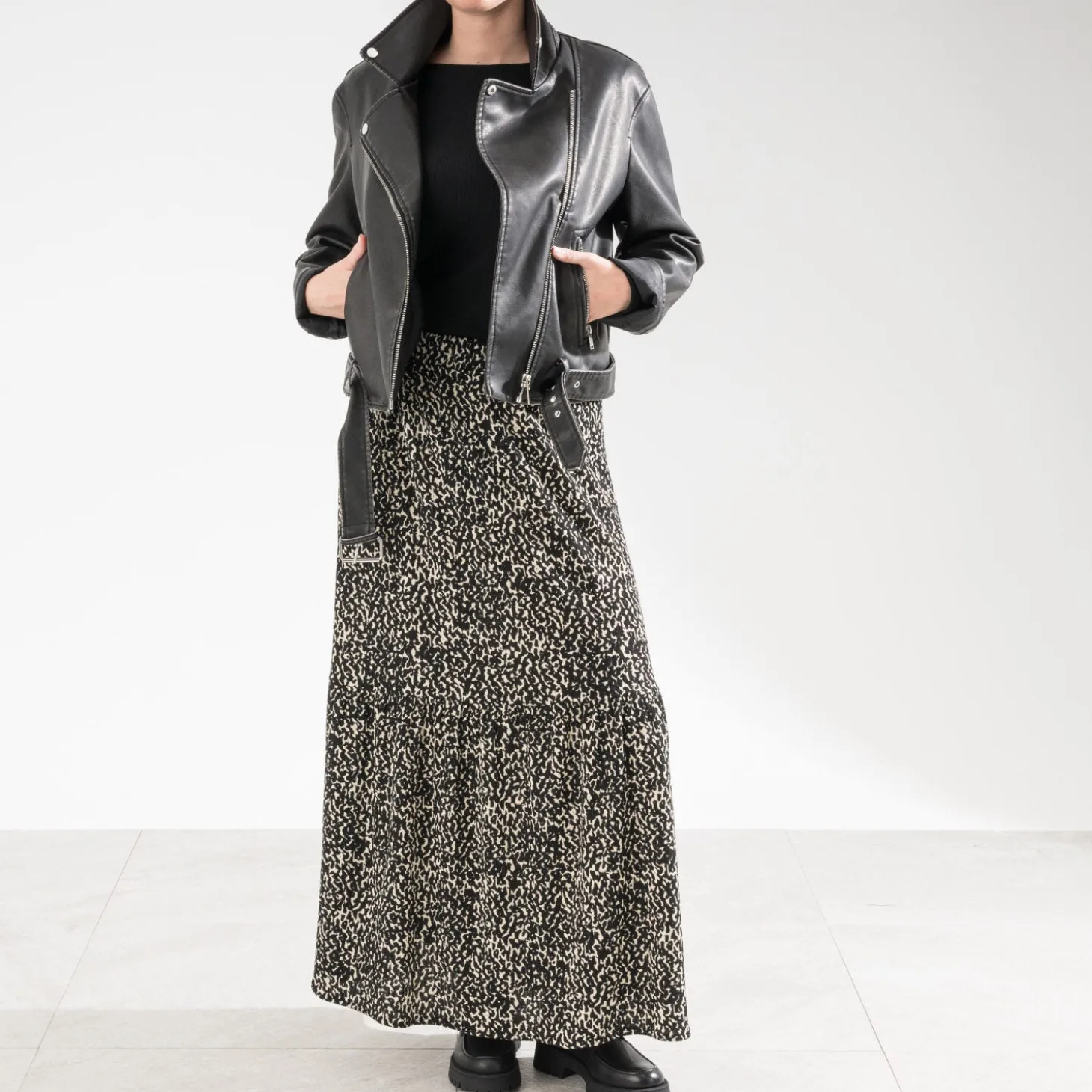 Laissez-vous tenter par le motif animalier, qui fait un retour remarqué. Il s’invite sur cette jupe longue dans les tons de noir et beige. Rendez-lui son esprit rock avec un top noir, un blouson en cuir et une paire de boots crantés.