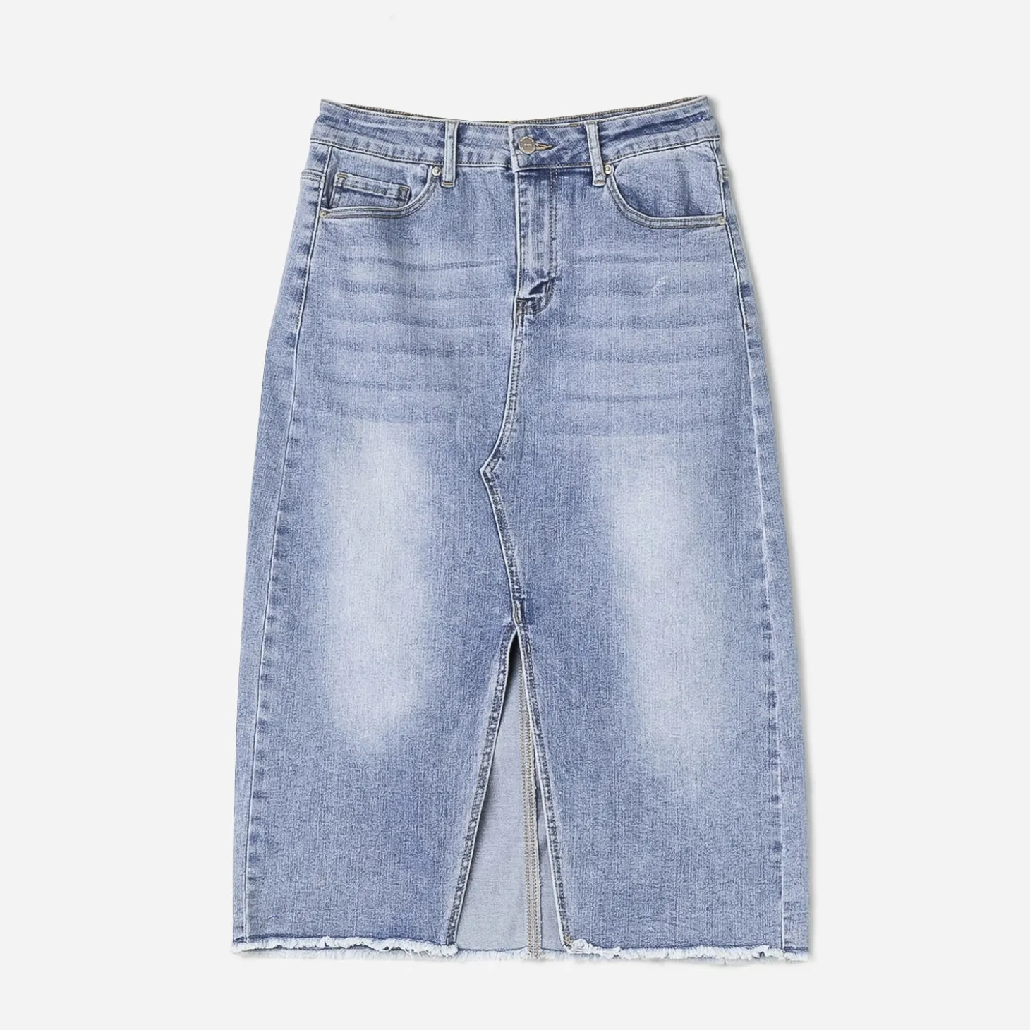 C’est LA pièce incontournable à avoir dans sa garde-robe cette saison. La jupe en jean bleu délavé opte pour une longueur midi, avec fente au milieu devant pour gagner en aisance. Les fashionistas la porteront avec un débardeur blanc, des chaussettes et une paire de sneakers.