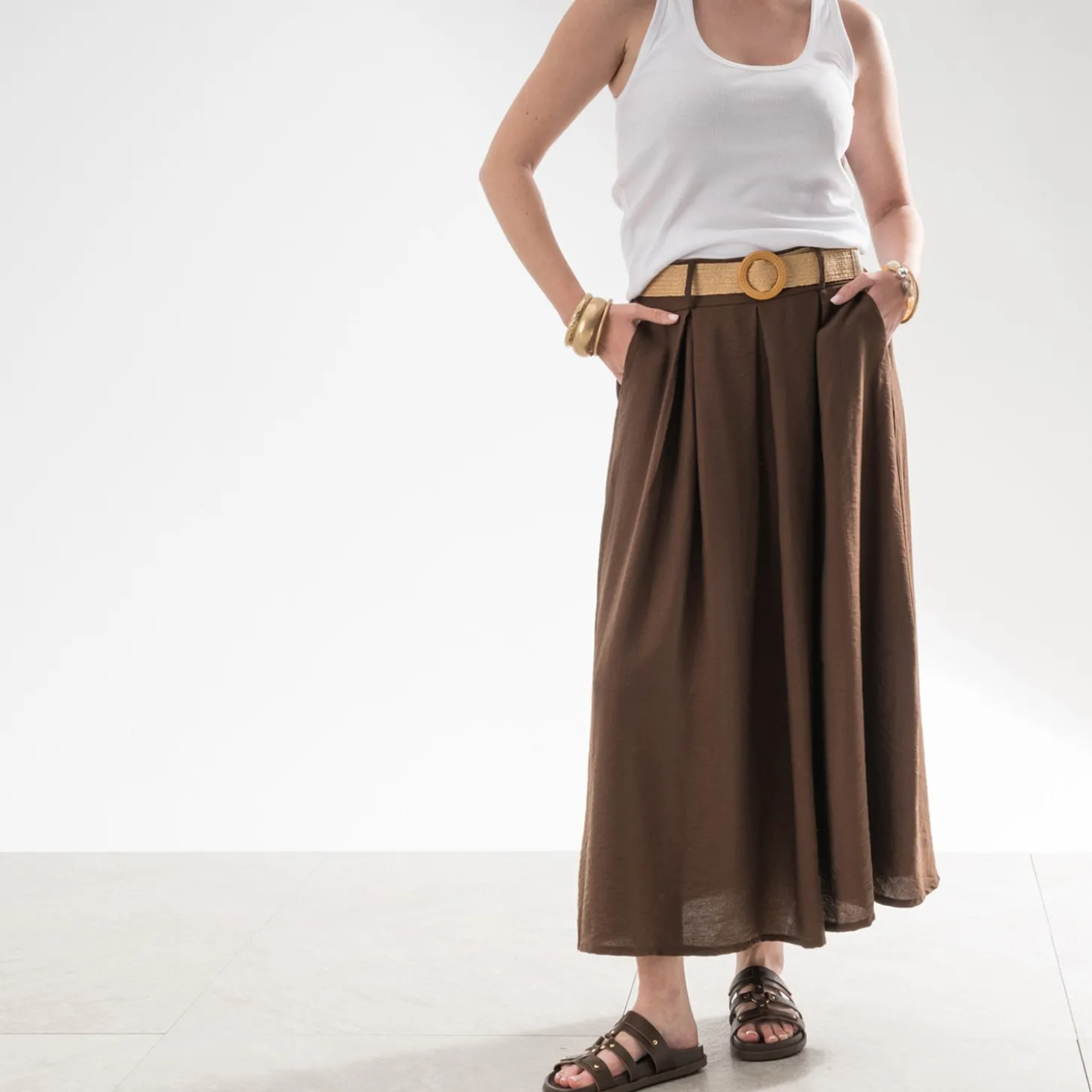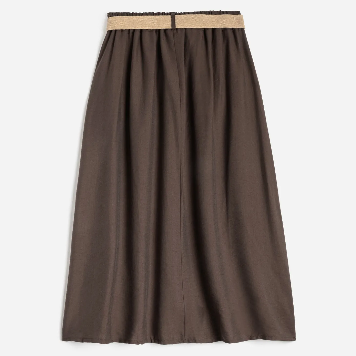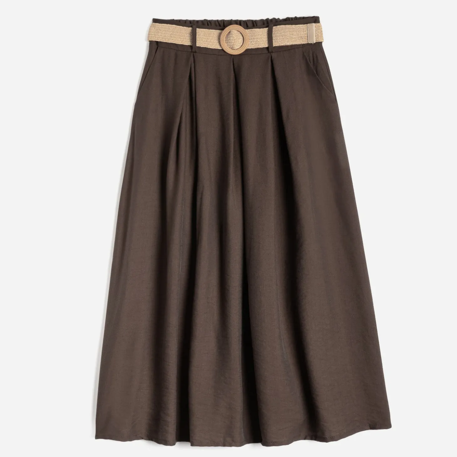 Les beaux jours marquent le retour des jupes plus légères, plus fluides. Adoptez-la dans un coloris chocolat, très actuel, et dans une longueur midi, ni trop courte, ni trop longue. Son atout ? Une ceinture amovible beige, façon raphia tressé, qui lui assure un twist ethnique. Un modèle à associer avec un débardeur blanc, des mules plates marron et des bracelets dorés.