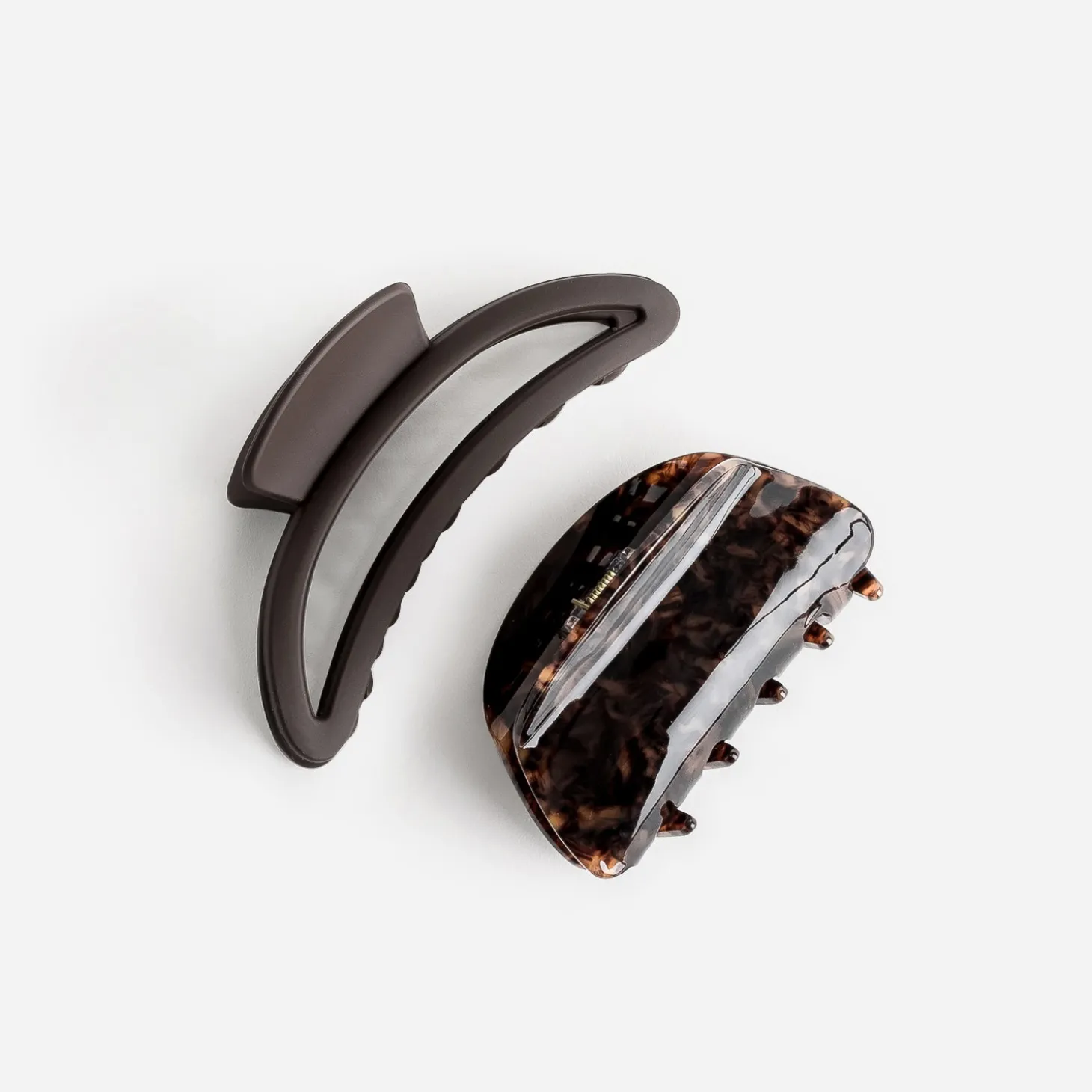 Leur vrai nom ? C’est pince-crabe, en rapport à leur forme et à leurs ‘griffes’, qui permettent de bien maintenir les cheveux. L’une mate, l’autre façon écaille, ces deux modèles marron sont vos alliés pour les attacher, tout au long de l’année.