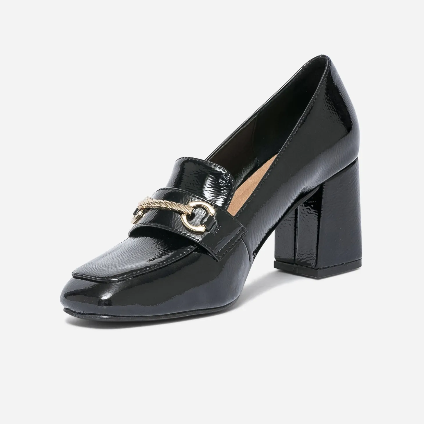 Coloris noir et finition vernie, jusqu’au talon. Talon carré à la fois large et haut de 7 cm, pour une meilleure stabilité. Mors fantaisie en métal doré, posé sur le dessus du pied. Ce mocassin multiplie les atouts pour séduire, la femme active, avec une robe chemise, la femme rebelle, avec une chemise à carreaux, la femme classique, avec une jupe midi.