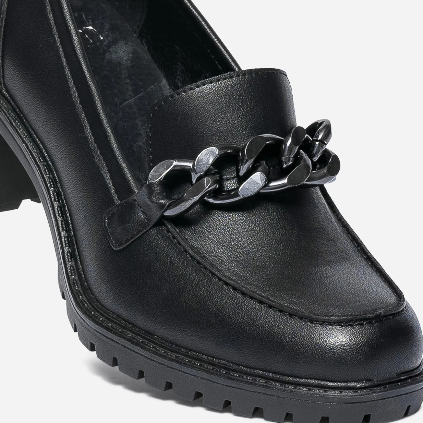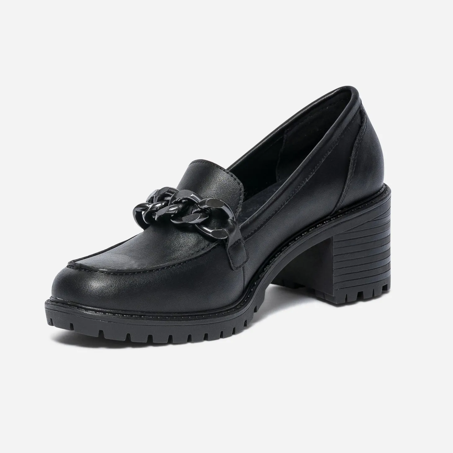 Monté sur un talon de 6 cm, le mocassin femme bouscule les codes. En matière synthétique noir, il présente une semelle crantée et une grosse chaîne en métal gun sur le dessus du pied. Facile à porter, facile à associer, ce modèle mérite d’être essayé.