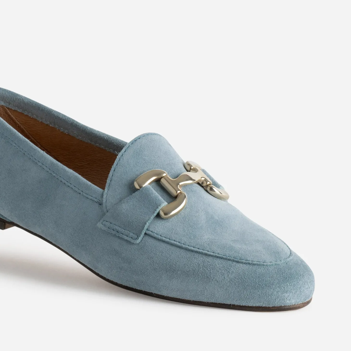 Un modèle plat, sublimé par un maxi mors en métal doré. Un coloris bleu ciel « baby blue », sublimé par le cuir velours. Ce mocassin pour femme est une valeur sûre, qui ne vous décevra pas. Son meilleur allié ? Un jean slim blanc, à associer avec un top camel et une veste en jean, avec un top parme et un pantalon à motif toile de Jouy en week-end.