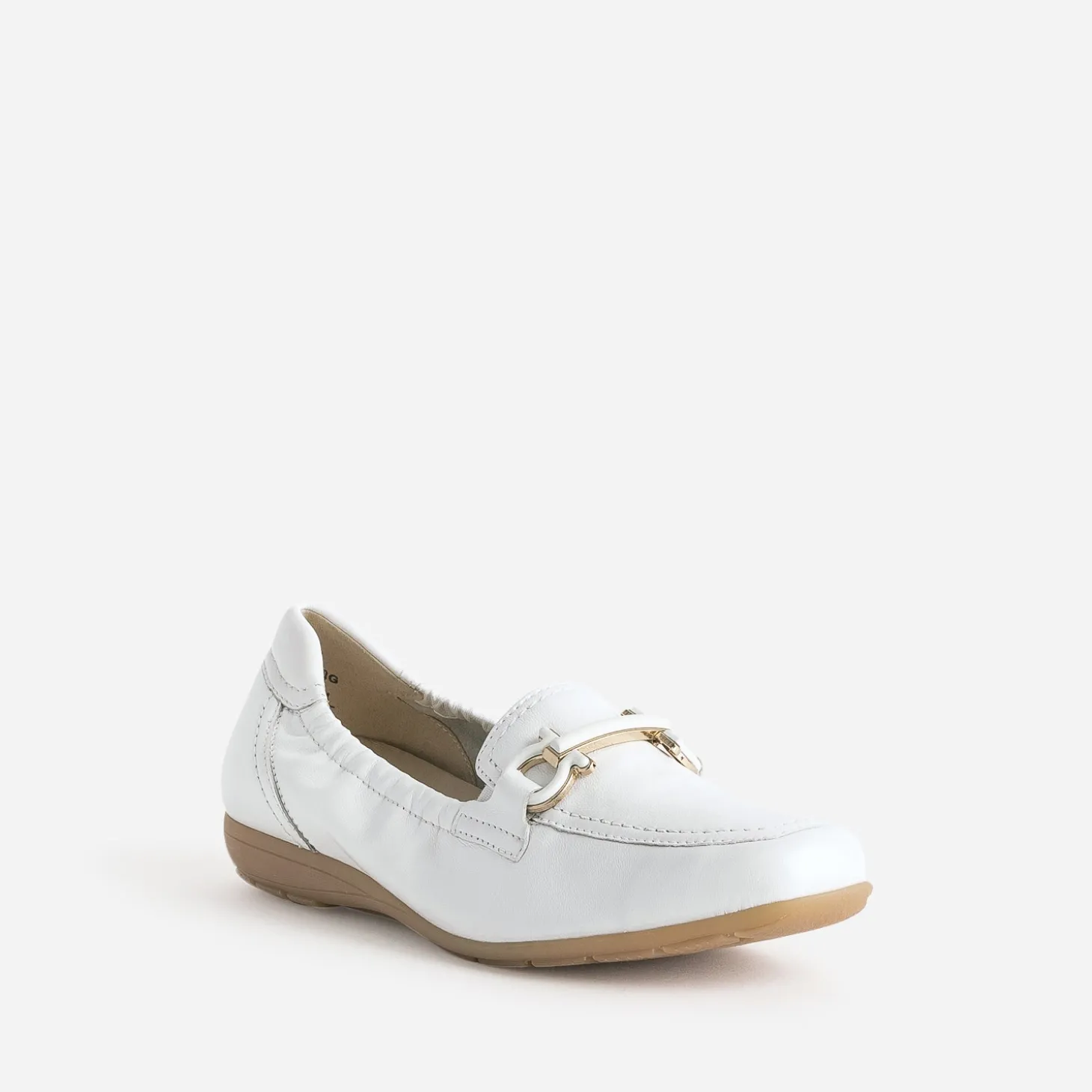 Tige élastiquée, semelle extérieure en gomme, semelle première en cuir dotée de la technologie ‘onAIR’, garantissant un meilleur amorti et une aération optimale de la chaussure : le nouveau mocassin gagne encore confort. En cuir souple non doublé, il se décline en coloris blanc avec finition légèrement nacrée. Le dessus du pied est décoré d’un mors fantaisie ton sur ton. Un modèle à privilégier, par exemple, avec un costume-pantalon beige.