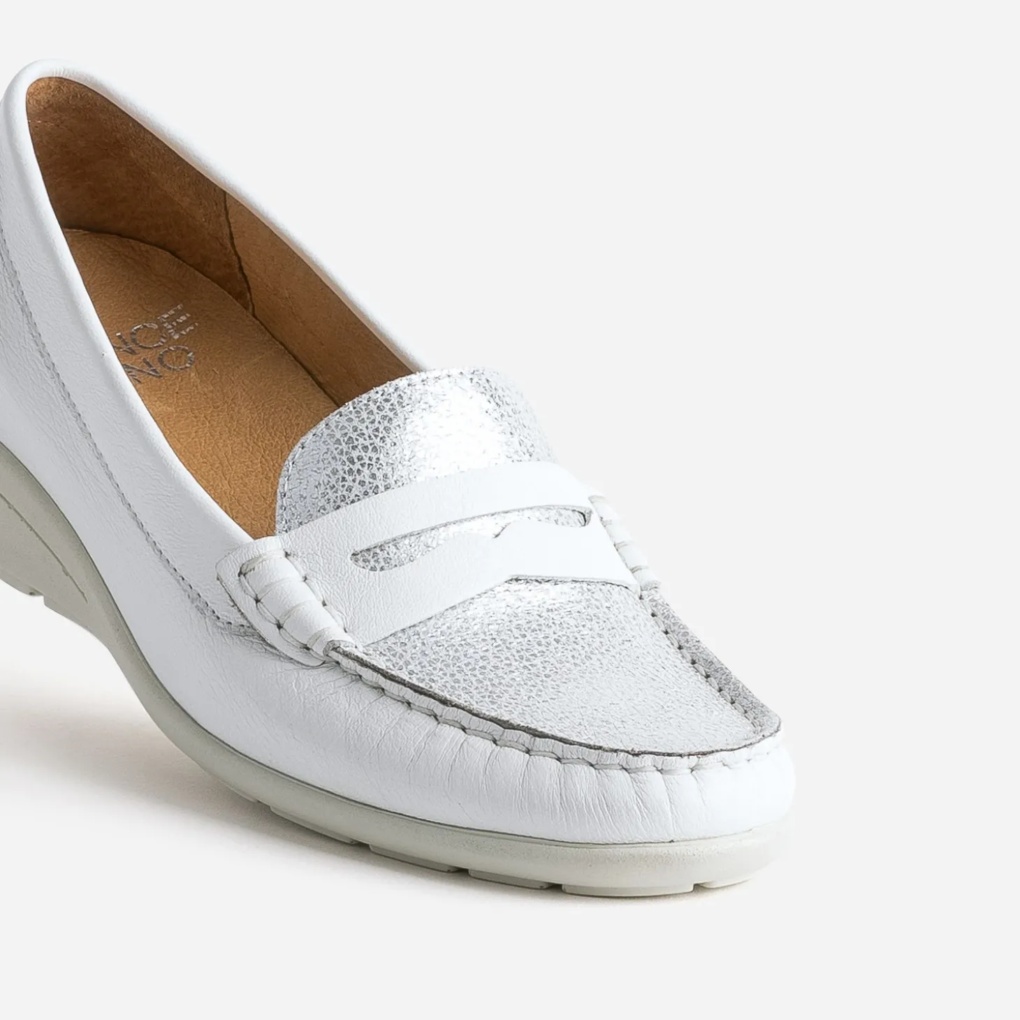 Le mocassin pour femme revendique un style masculin-féminin évident. Il gagne en confort, grâce à une semelle légèrement compensée et une semelle intérieure amovible, pour pouvoir placer celle parfaitement adaptée à votre plante de pied. Confectionné en cuir lisse, il joue le duo blanc et argenté, sublimé par un motif animalier sur le dessus. Préférez-le pied nu, avec un tailleur-pantalon blanc ou gris.