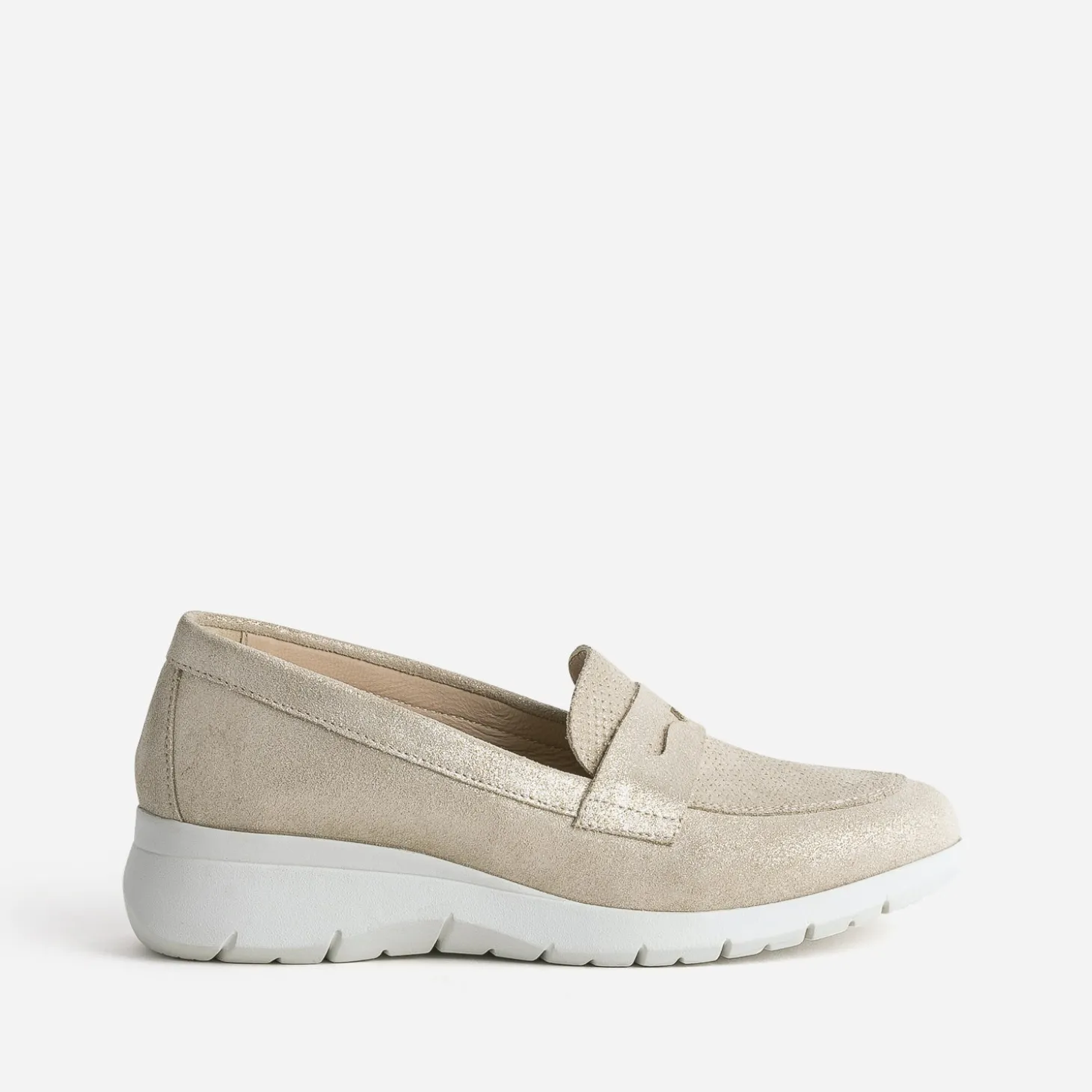 Succombez au confort du mocassin femme, grâce à une semelle légèrement compensée et une semelle intérieure amovible, pour pouvoir placer celle parfaitement adaptée à votre plante de pied. En cuir velours, il s’autorise une version dorée irisée et un embossage effet perforé sur le dessus de la tige. Préférez-le pied nu, avec un tailleur-pantalon, pour un esprit masculin-féminin étudié.