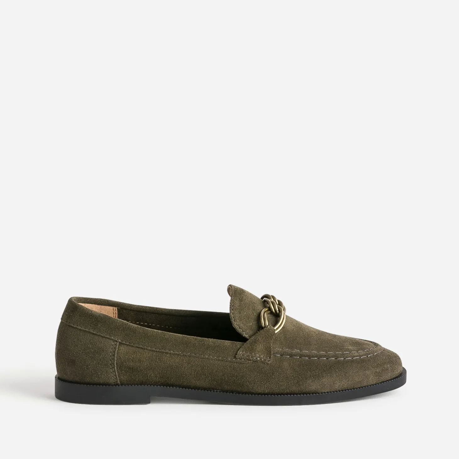Et si vous osiez une version colorée ? Le mocassin femme se décline en kaki, sublimé par un cuir velours. Sa ligne sobre est rehaussée d’un mors fantaisie, en métal jaune vieilli et tressé. Un modèle qui gagne en chic, avec une chemise blanche esprit liquette entièrement boutonnée, sur un pantalon droit vert sauge à revers fixes.