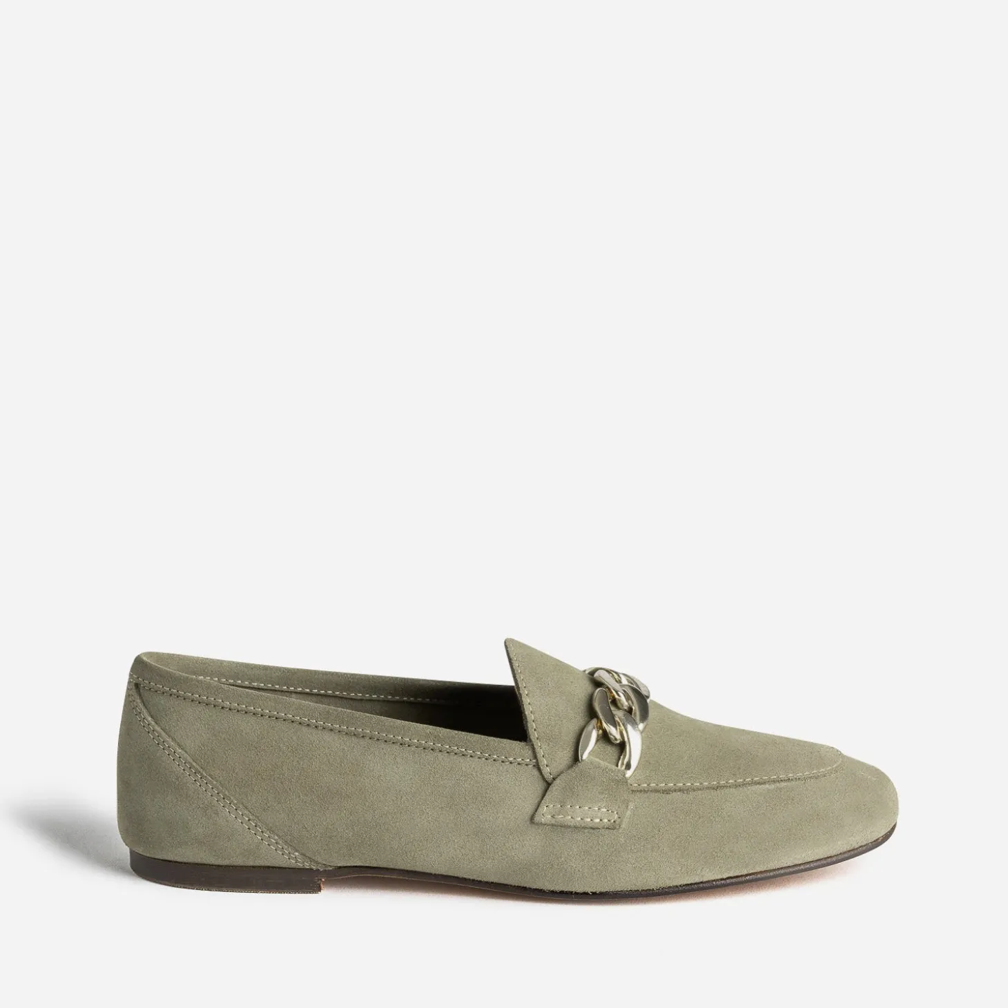 En cuir velours et non doublé, ce mocassin femme est gage de confort avant tout. Son coloris kaki s’inscrit dans la tendance et sa maxi chaîne en métal doré apporte une touche chic. Associez-le avec des tons automnaux, comme le camel, le safran ou le bordeaux.