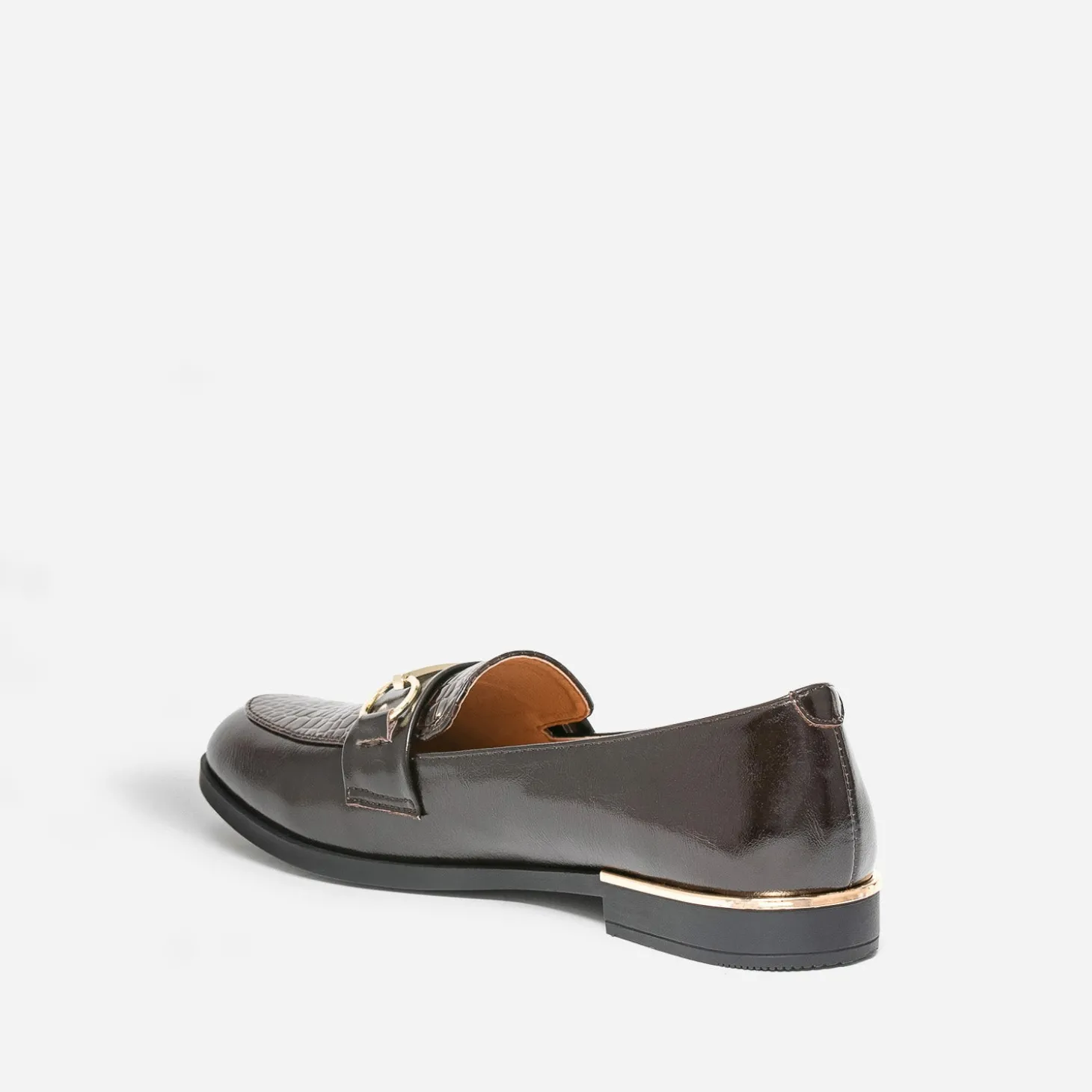 D’une élégance rare, ce mocassin emprunte des chemins de traverse pour mieux se réinventer. D’abord par un sublime coloris marron foncé, avec finition glacée et embossage effet python et verni. Ensuite par un mors en métal doré, sur le dessus du pied, en écho à la barrette posée sur le talon. Accentuez son chic, avec un costume-pantalon gris à carreaux ou carrément parme ou rose fuchsia !