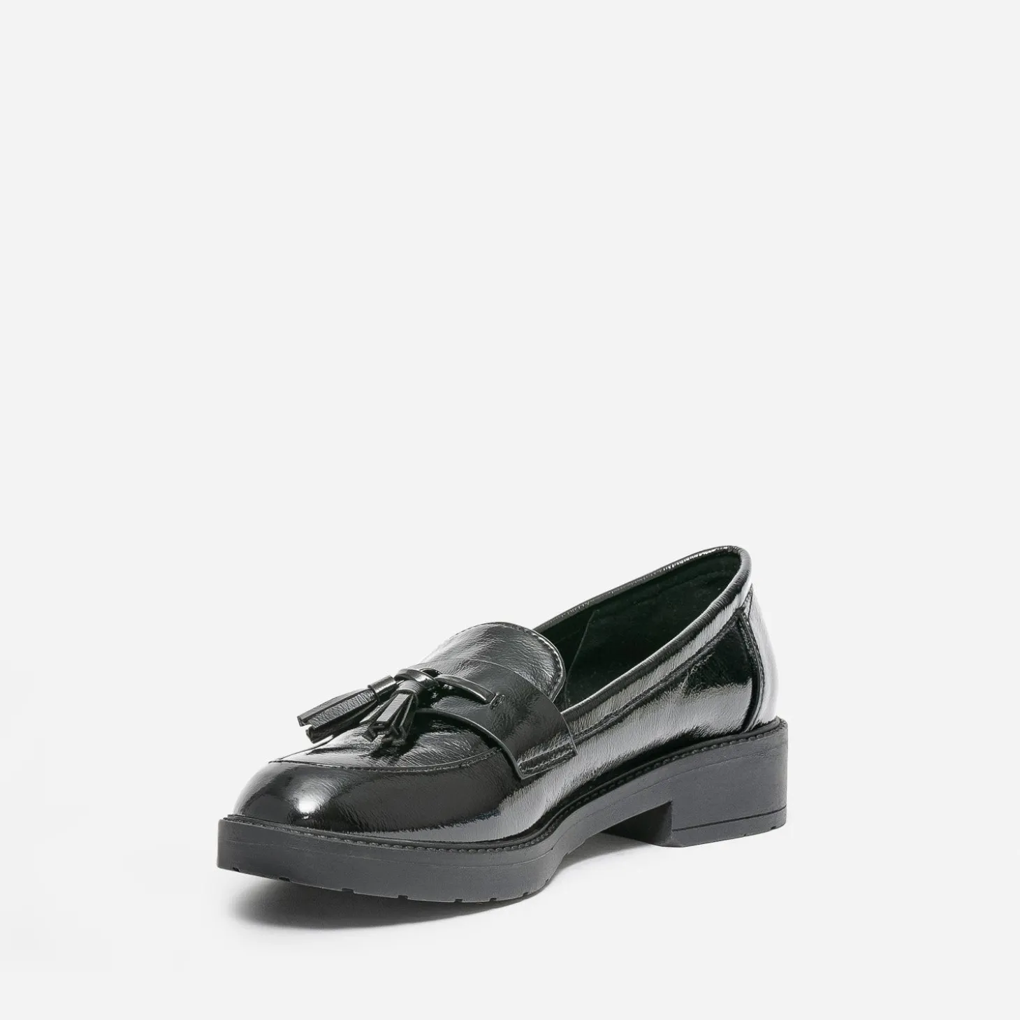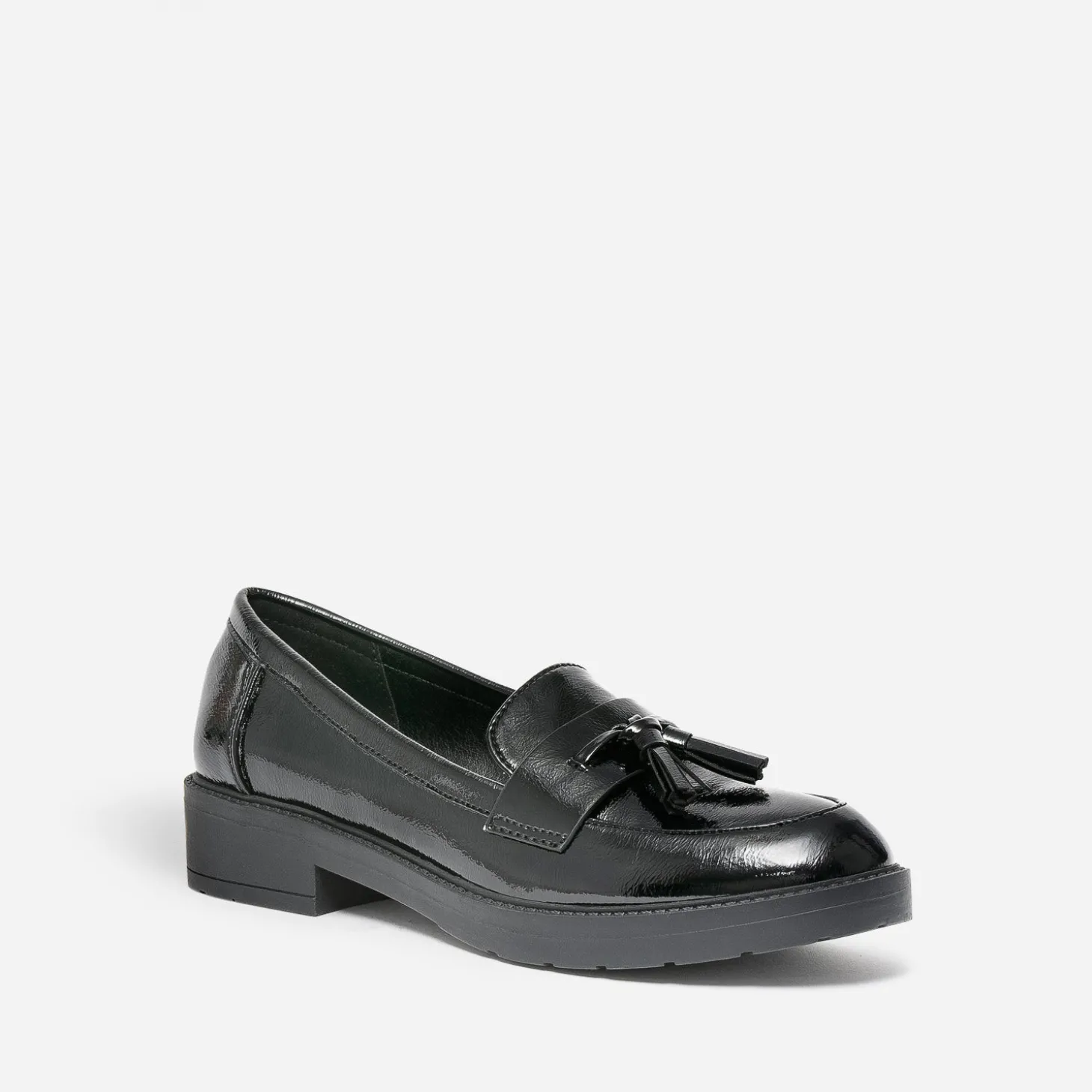 Dans la série des chaussures mi-saison, le mocassin tire son épingle du jeu. En matière synthétique noire, il se fait plus chic, grâce à sa finition vernie et ses deux pampilles sur le dessus du pied. Signature preppy par excellence, il se porte avec ou sans chaussettes, à choisir blanches et hauteur cheville, avec une robe ou une jupe courte et une veste de costume.
