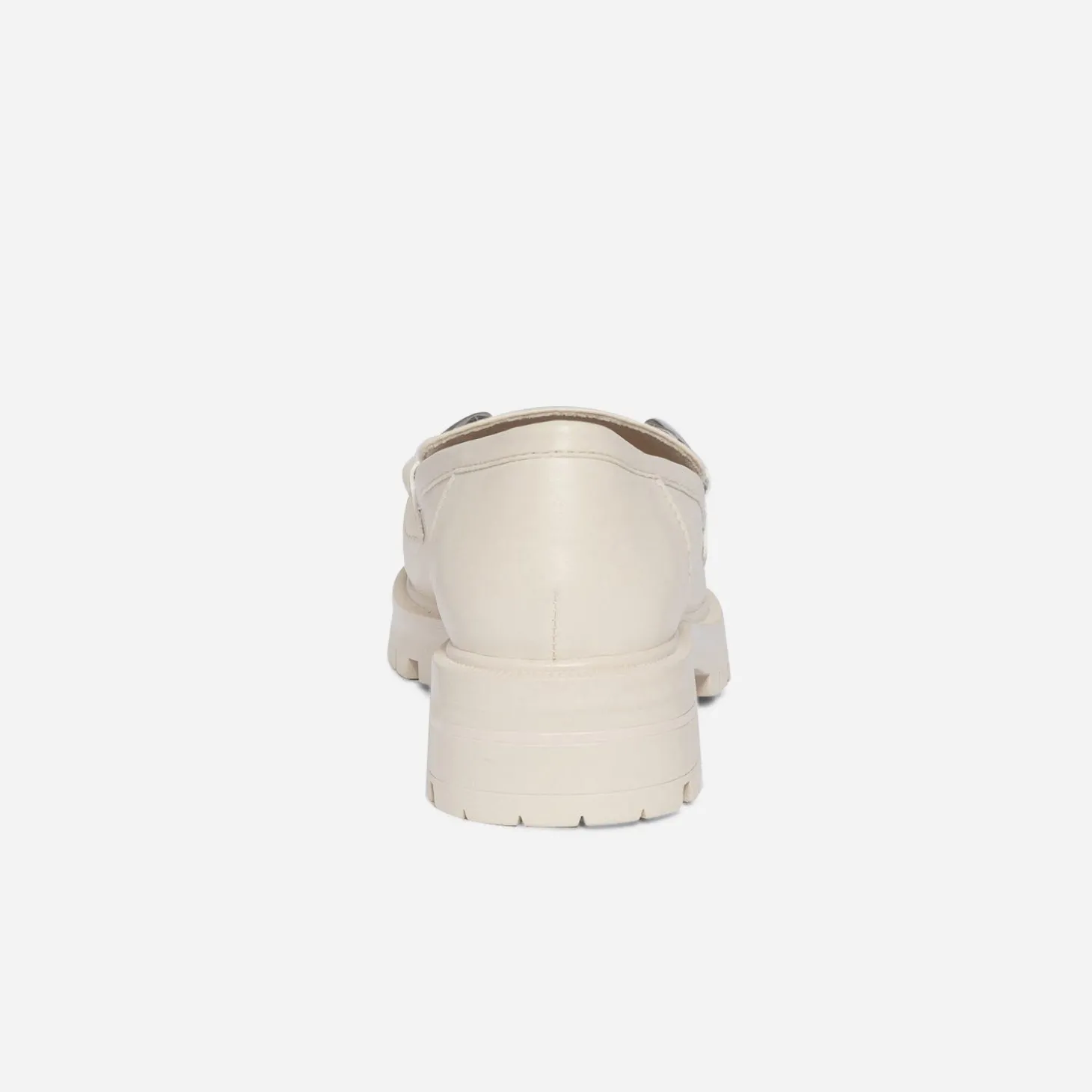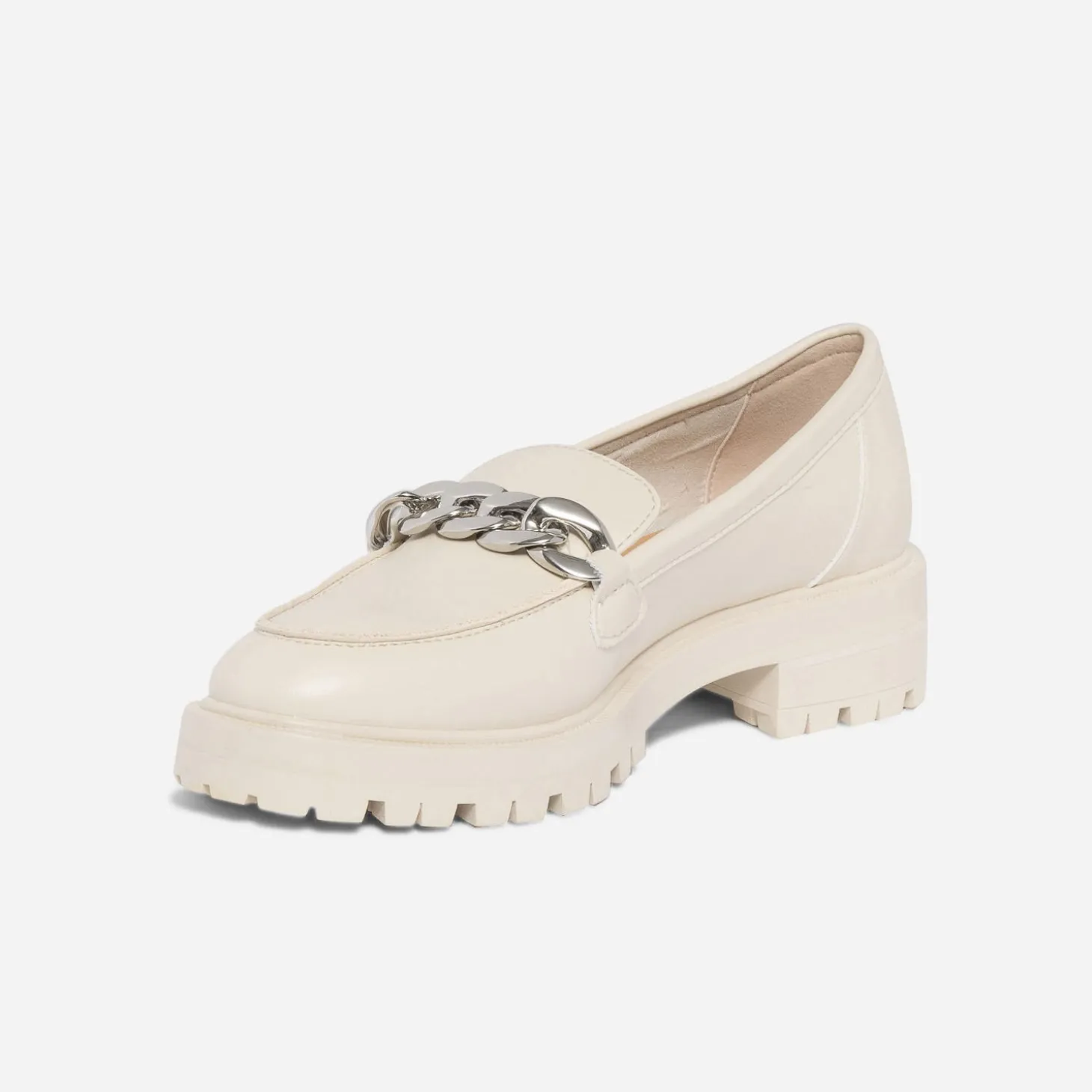 Ce mocassin femme compile toutes les tendances du moment. Un coloris beige, idéal dès le printemps, une semelle épaisse et crantée et une maxi chaîne en métal argenté façon bijou. Un modèle à associer avec un costume uni ou même imprimé, pour un look masculin-féminin assumé.