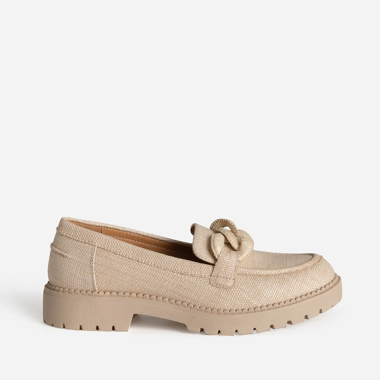 Sur le dessus, sur la maxi chaîne-gourmette, le tressage façon raphia envahit ce mocassin pour femme. En matière synthétique beige, il est monté sur une semelle crantée ton sur ton, garant d’une belle modernité. Un modèle pile dans le style masculin/féminin, complice de vos costumes? unis ou imprimés.