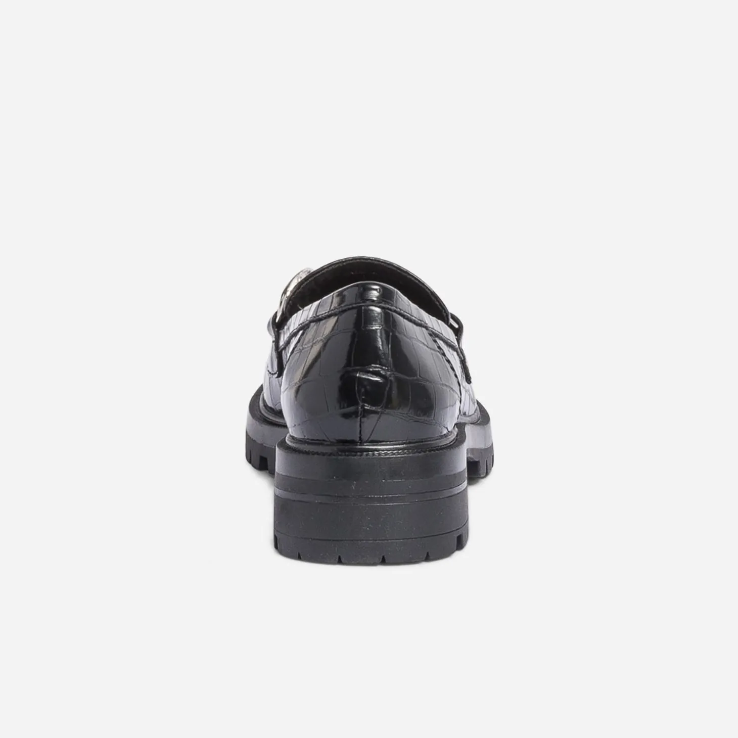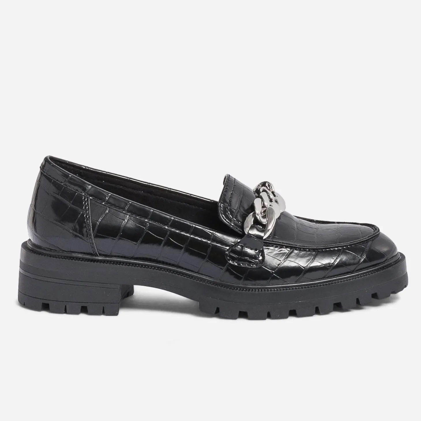 Oubliez tout ce que vous saviez sur le mocassin femme. Cette saison, il impose, on ose ! Semelle crantée, talon large, embossage effet croco et grosse chaîne en métal blanc, il conserve un coloris noir qui matche avec tout. Un modèle à essayer avec une jupe longue et plissée ou avec une tenue qui mixe avec soin les imprimés.