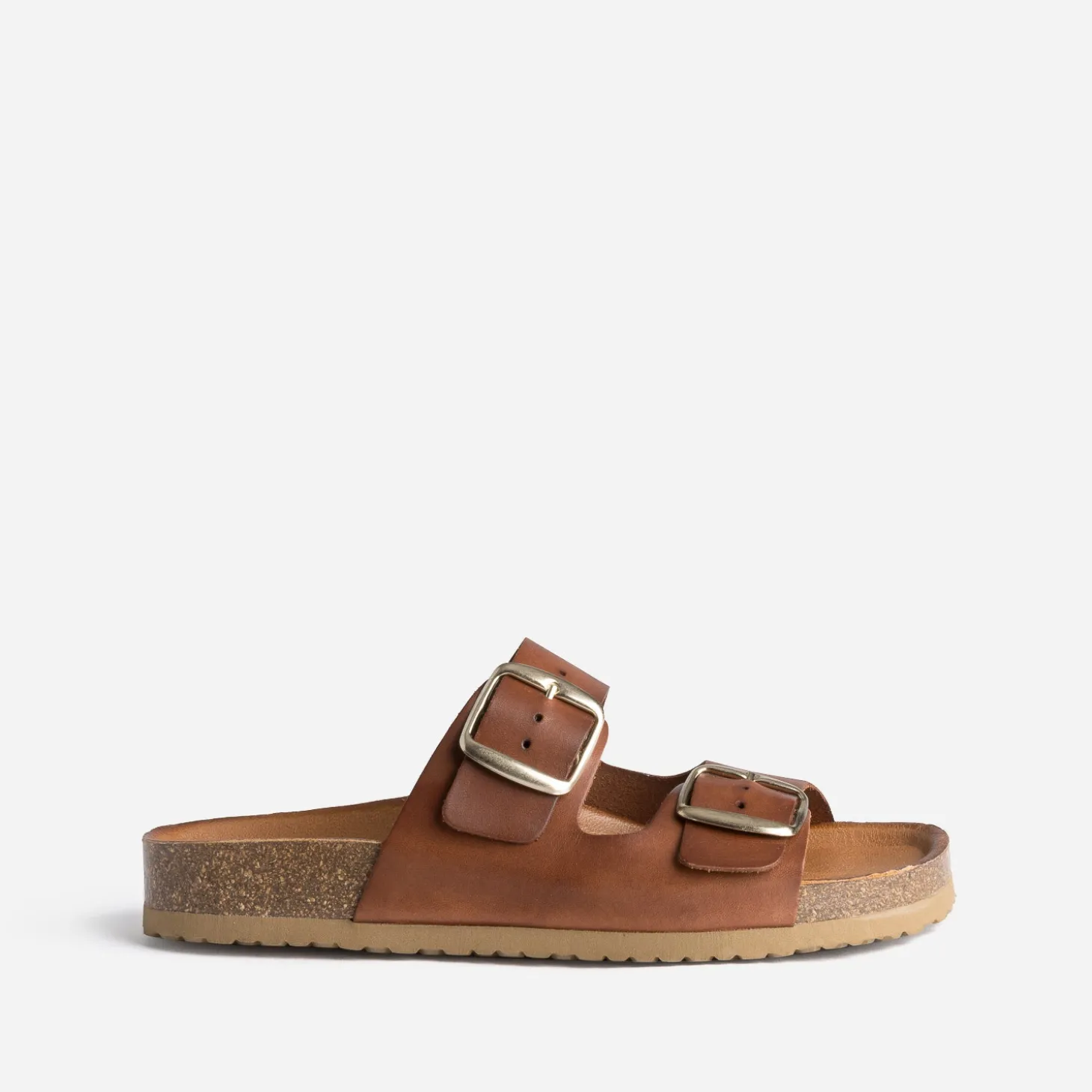 Tige en cuir sur première en cuir, la mule anatomique est un essentiel du shoesing estival. Elle se décline en coloris camel, élégant et intemporel. Les deux larges brides peuvent s’ajuster au pied, par des boucles en métal doré. Un modèle à réserver avec un look décontracté, marinière et pantalon chino.