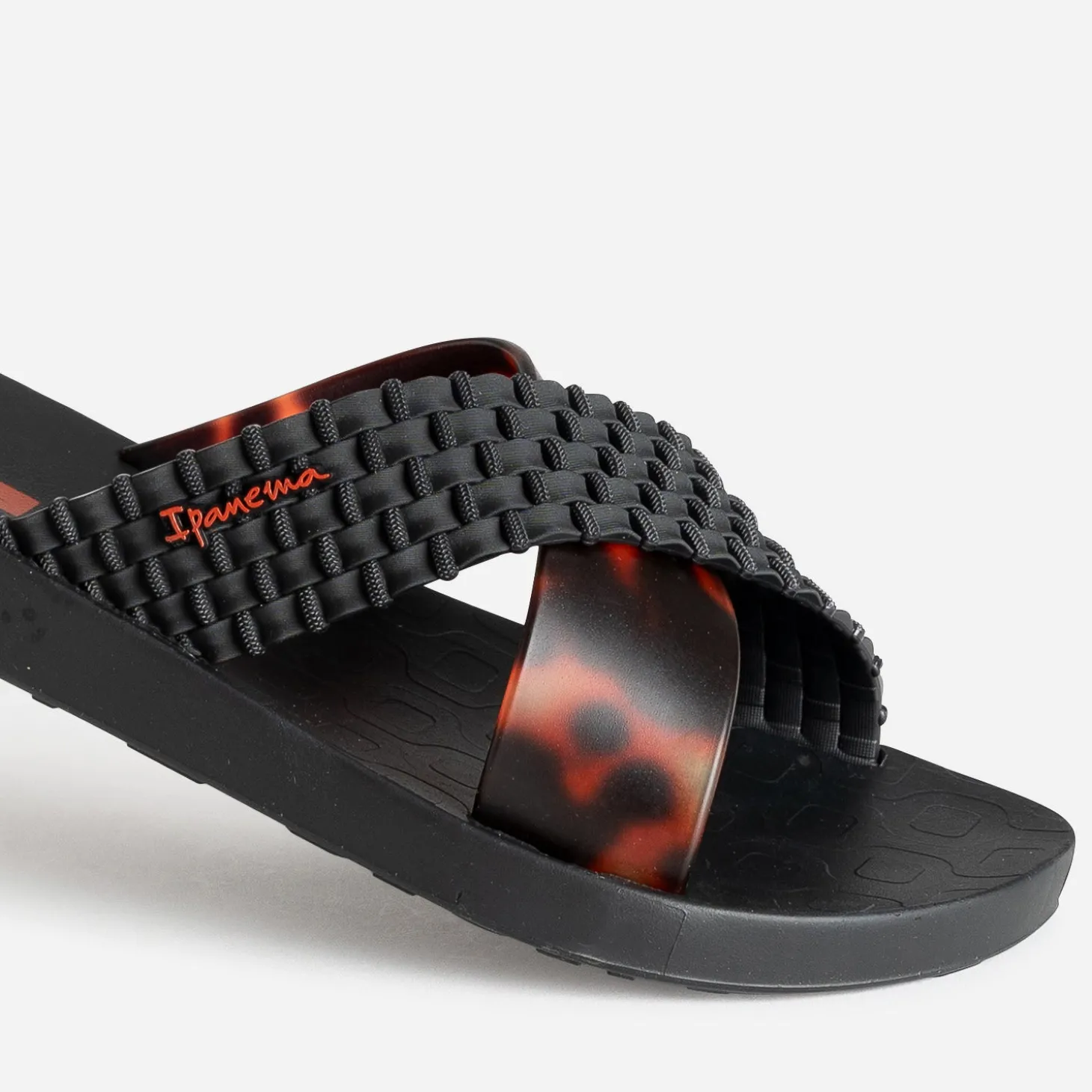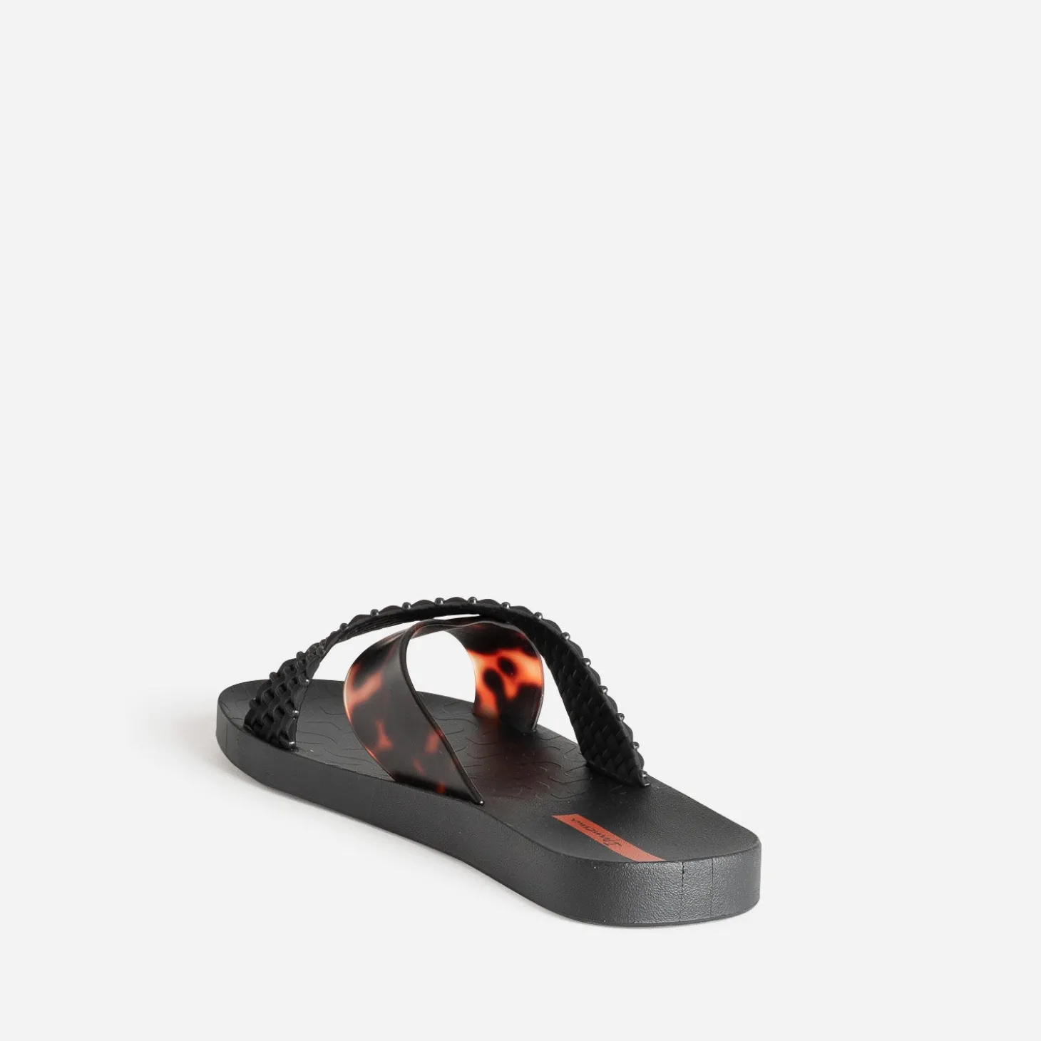 Revoir ses priorités de l’été, c’est d’abord focaliser sur la mule et son confort inégalé. Le pied est maintenu ici par deux larges brides, l’une noire et tressée, l’autre marron à motif écaille, le tout dans un plastique souple recyclé. Un modèle aussi à l’aise en maillot et short qu’en robe longue, pour prolonger la soirée sur le bord de la plage.